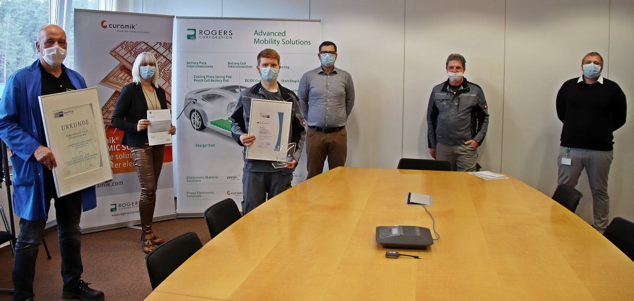 Zusammen strahlen die Rogers-Geschäftsführer, Ausbilder und allen voran der Mann der Stunde um die Wette: Frank Nickl hat sich als Auszubildender zum Verfahrensmechaniker Kunststoff- und Kautschuktechnik an die Spitze der Besten gekämpft. Bei seiner Abschlussprüfung hat er die volle Punktzahl erreicht und damit das beste Ergebnis aller Auszubildenden in Deutschland erreicht.