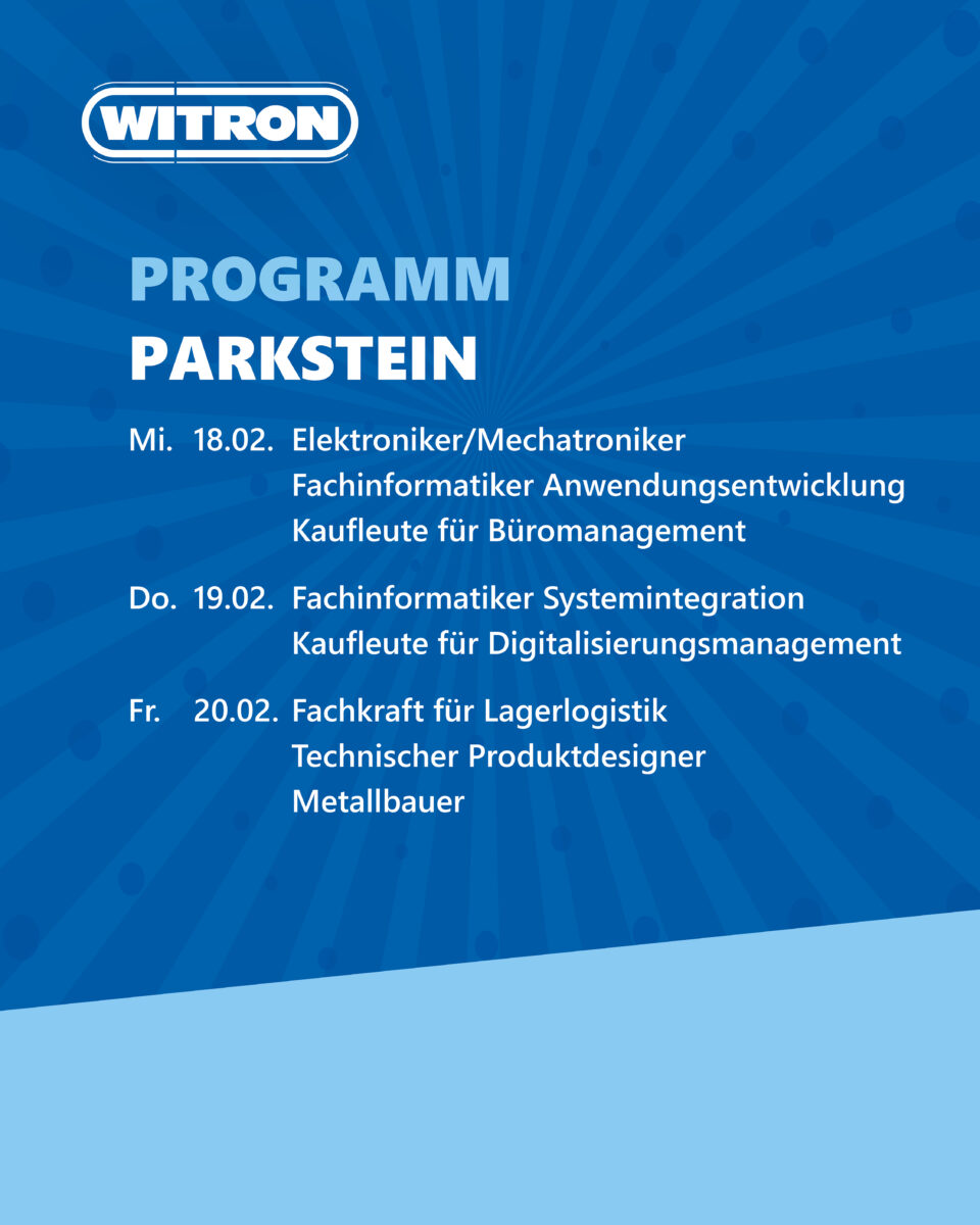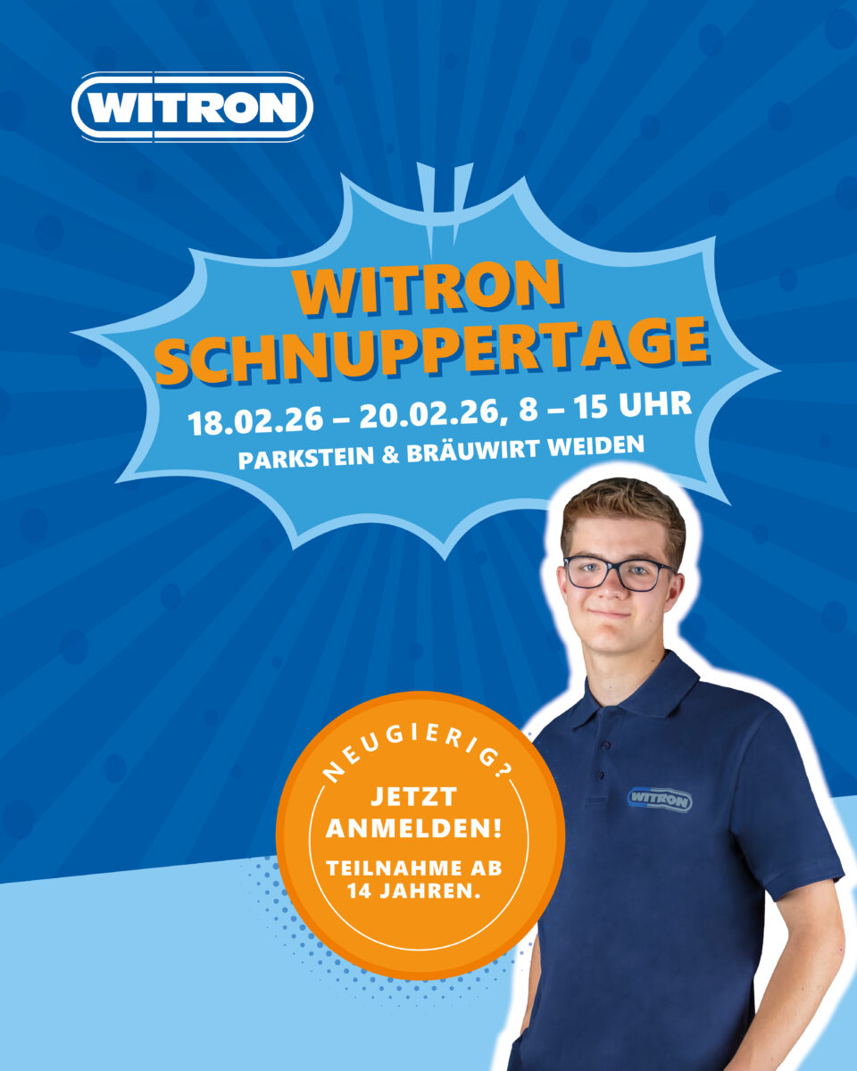 Während der Schnuppertage bei WITRON tauchst du direkt in den Arbeitsalltag eines Global Players ein und lernst mehrere Ausbildungsberufe auf einmal kennen. Von 8 bis 15 Uhr kannst du hinter die Kulissen schauen, Fragen stellen und herausfinden, welcher Weg zu dir passt. Die Teams in Parkstein und Weiden nehmen sich bewusst Zeit für dich – persönlich, offen und auf Augenhöhe. Melde dich jetzt an und mach dir dein eigenes Bild.