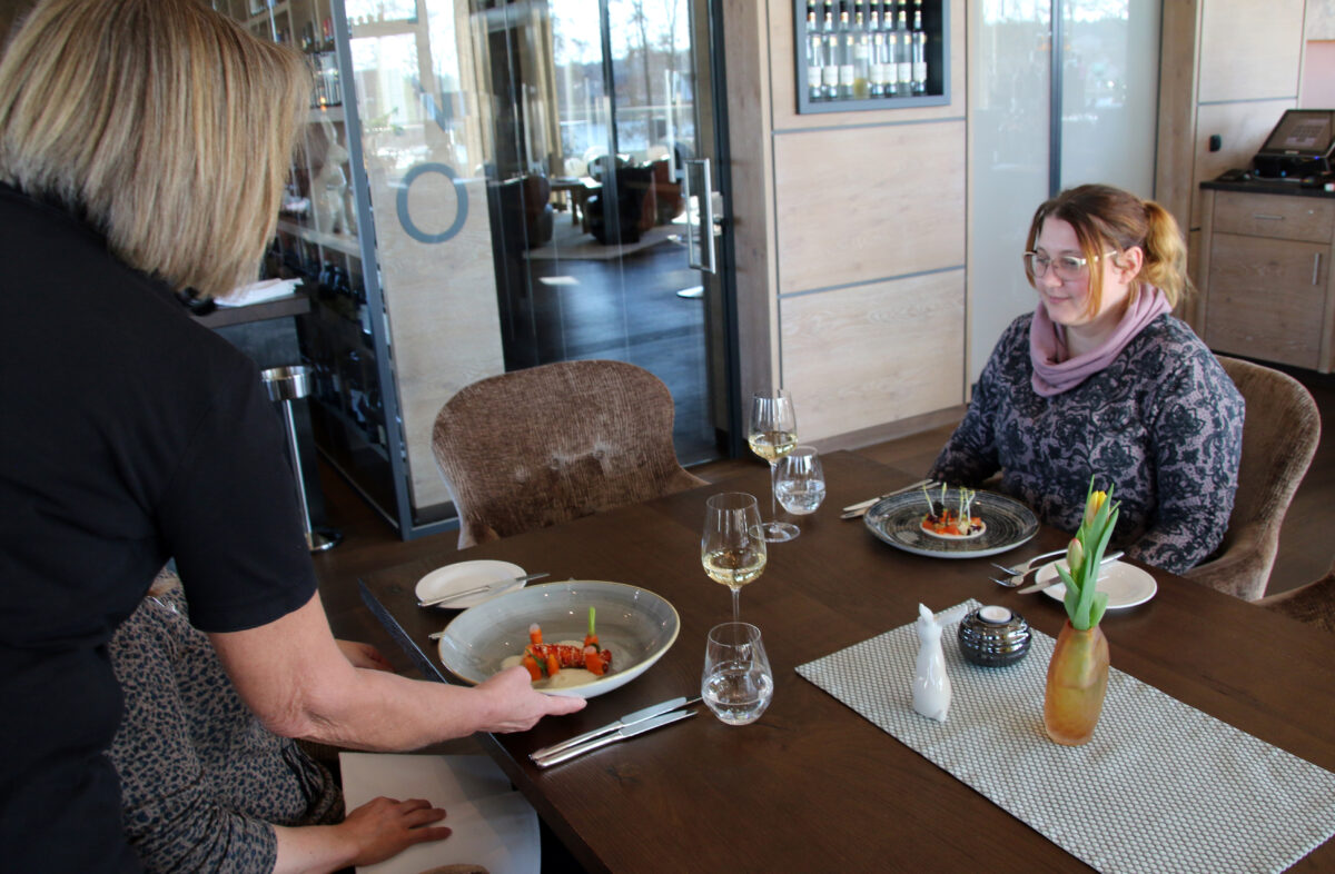 Maria Kraus serviert heute zwei Testesserinnen das leckere Kunstwerk. Sie ist seit 2017 Restaurantleiterin im Elements: „Wir haben hier viele Einsatzmöglichkeiten“, schildert sie, „das Mitarbeiter-Restaurant News ist tagsüber geöffnet, das Elements abends.” Hier finden auch die beliebten Veranstaltungen wie Hochzeiten, Geburtstage oder Motto-Tage wie Grill- und Weinabende statt. Auch die Gäste der Tagungsräume kommen in den Genuss der Preziosen der Meisterküche. „Als ich von Herrn Engels gastronomischen Projekt gelesen habe, habe ich mich gleich beworben – das war mein Traum hier als Restaurantleiterin noch einmal was Neues zu beginnen“, sagt Kraus.