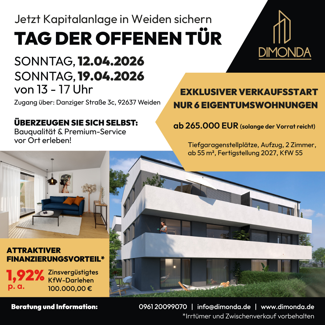Wenn Sie auf der Suche nach einer Immobilie mit Zukunft sind, lohnt es sich, am Tag der offenen Tür, am Sonntag, 12. und 19.04.2026, vorbeizuschauen. Mehr Details zu den Informationsnachmittagen.