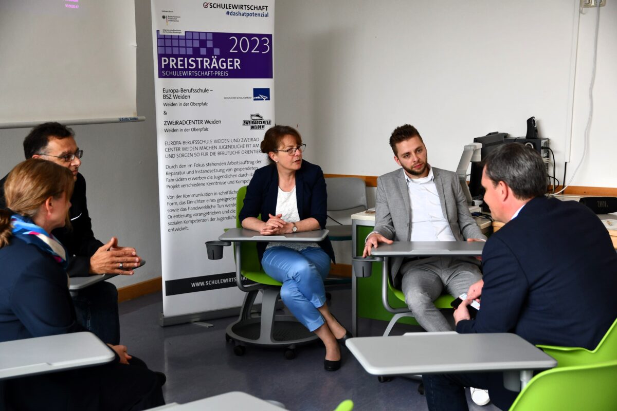 Im dritten Workshop berichtete Martina Auer-Bertelshofer über den Schule/Wirtschaft-Preis der Europa-Berufsschule in Zusammenarbeit mit dem Zweiradcenter Weiden. Mit Michael Bäumler und Rosemarie Winkelmann, sowie Matthias Vogl vom Zweirandcenter, schilderten sie, wie sie ein Fahrradprojekt als Berufsvorbereitung für die Jugendlichen ohne Ausbildung genutzt werden. An Fundfahrrädern der Stadt Weiden bastelten die Jugendlichen und erhielten so Motivation gerne in die Schule zu gehen, als Flüchtlinge die deutsche Sprache zu lernen und sich so eine bessere Ausgangsbasis für eine Berufsvorbereitung zu schaffen.