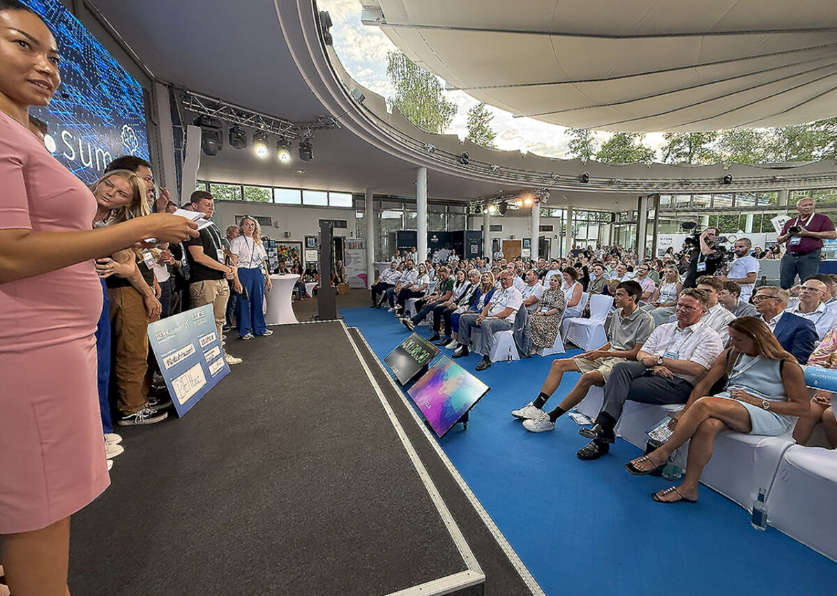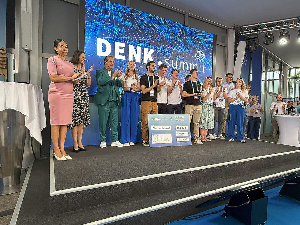 Hauptpreis von 15.000 Euro samt Trophäe überreichen das Veranstalter-Trio Pauline, Julian und Thomas sowie die Mitglieder der Jury an BEHtec für ihr fortgeschrittenes Konzept zum Leichtbau von Fahrzeugteilen mit Naturfasern (90 Prozent weniger CO₂, 30 Prozent leichter als Alu). Als Zweitplatzierte streichen Onsite.AI, Entwickler eines mobilen und skalierbaren Hochleistungsmikroskops to go, das stationäre Analysen ablöst und unter anderem mithilfe von KI Luftpartikel nach Schimmelspuren oder Blut nach Leukämie-Markern untersucht, 1000 Euro ein.