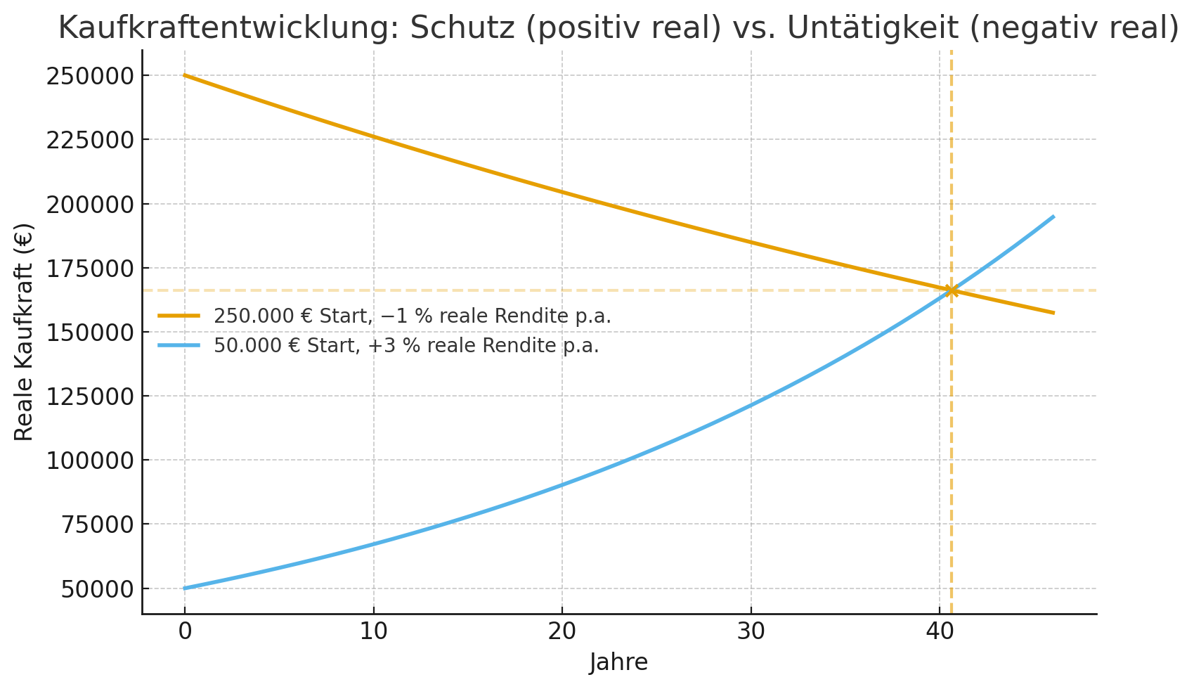 Wenn man ein Vermögen von 250.000 EUR auf dem Konto liegen lässt kann man sich nach 40 Jahren genauso viel leisten, wie ein Investor, der mit 50.000 EUR gestartet ist.
