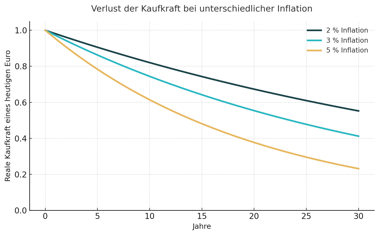 Selbst hohe Vermögen bieten keinen Schutz, wenn die Inflation dauerhaft wirkt. Ein Kapital von einer Million Euro verliert bei einer jährlichen Teuerung von zwei Prozent binnen 25 Jahren rund die Hälfte seines realen Wertes. Wer langfristig auf Bankeinlagen oder klassische Zinsprodukte setzt, erlebt daher eine stille Erosion des Wohlstands.