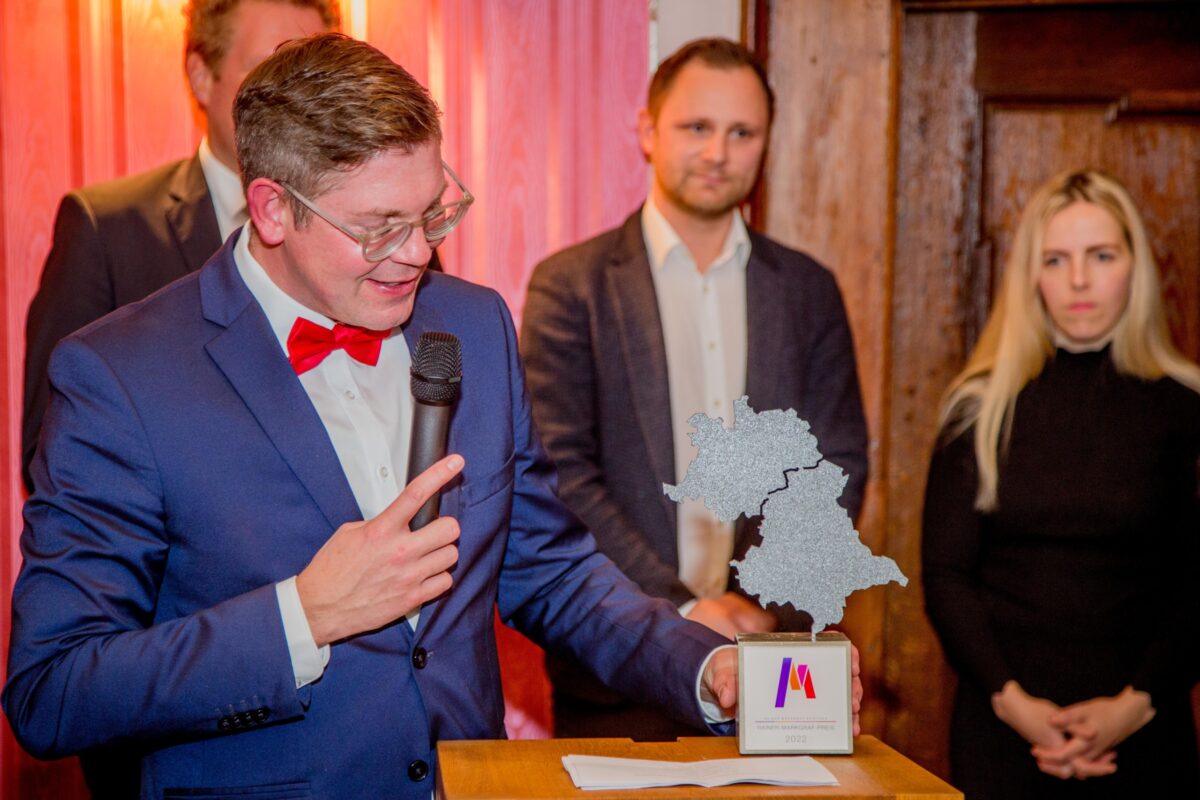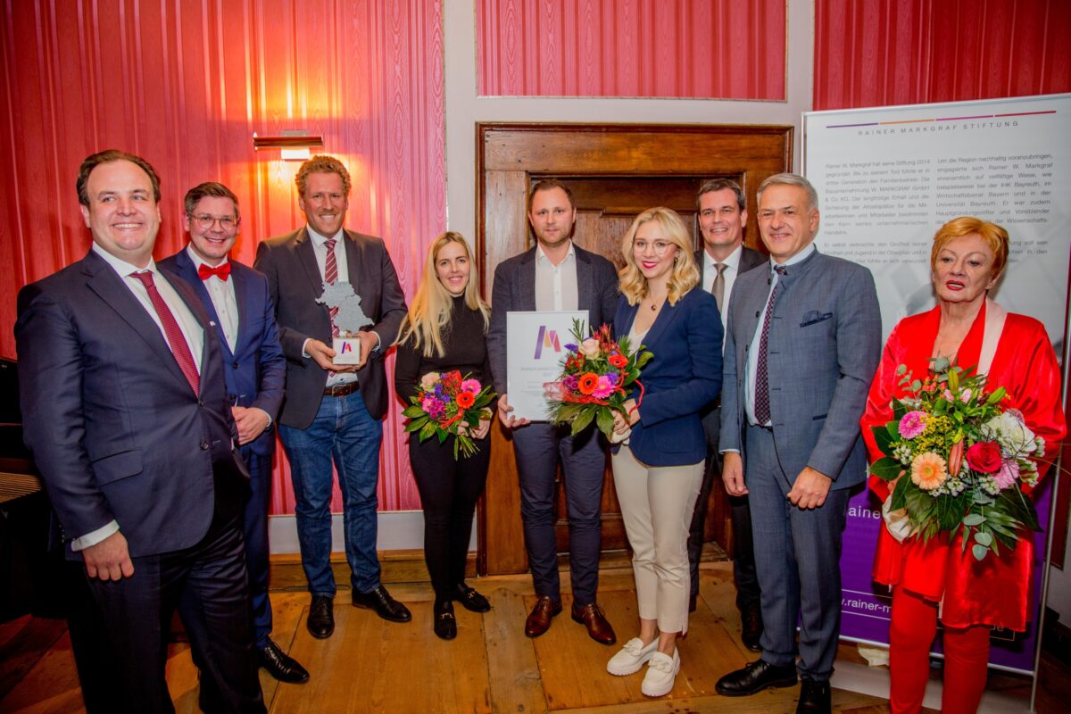 Zusammen mit Irene Markgraf übergab dann Florian Prosch die Urkunde sowie die Preisskulptur an die Vorstandschaft der Wirtschaftsjunioren. Ein feierlicher und bewegender Moment. Der Preis ist mit 20.000 Euro dotiert, das Preisgeld möchten die jungen Unternehmer für ein Anschlussprojekt verwenden.