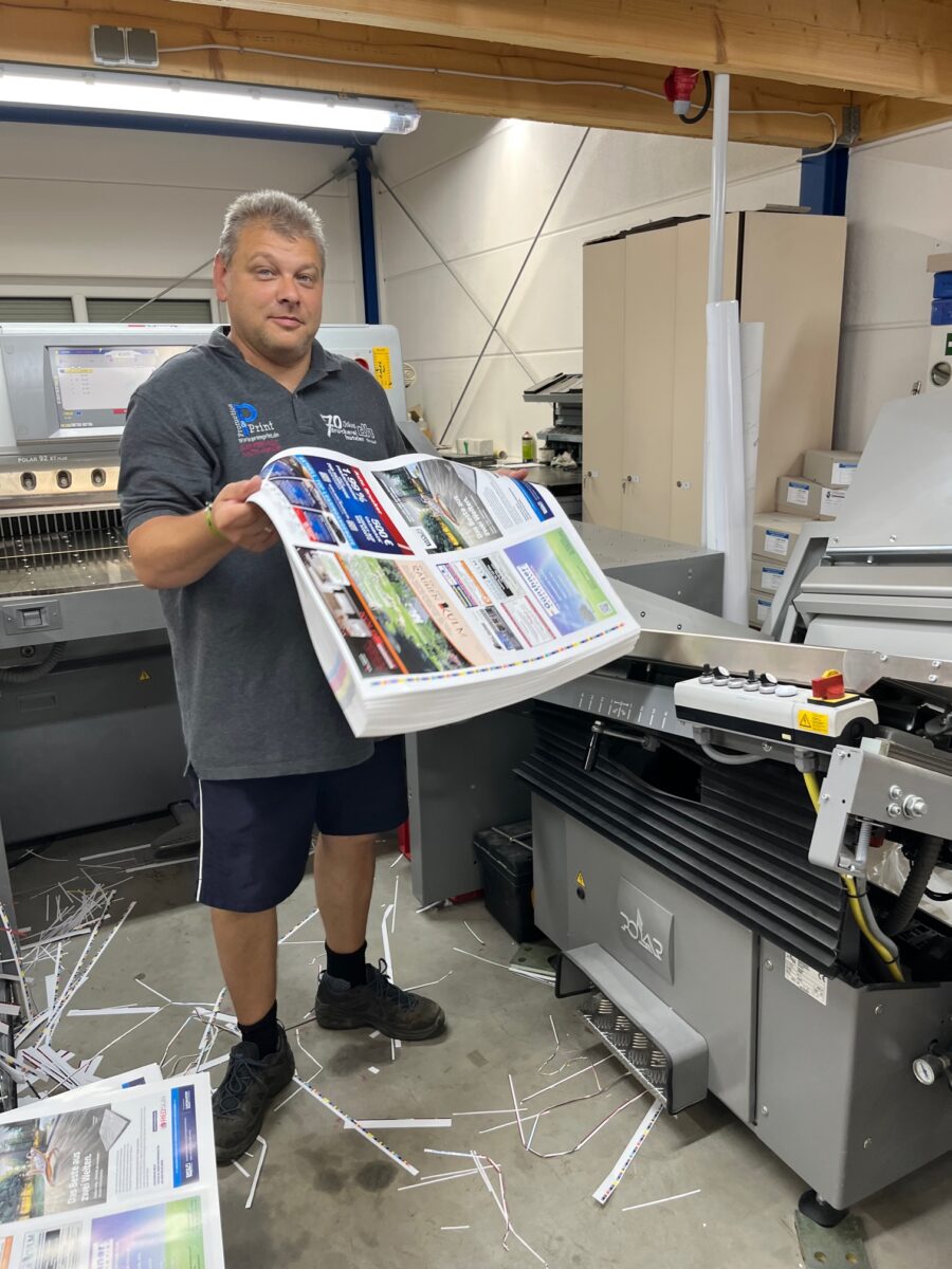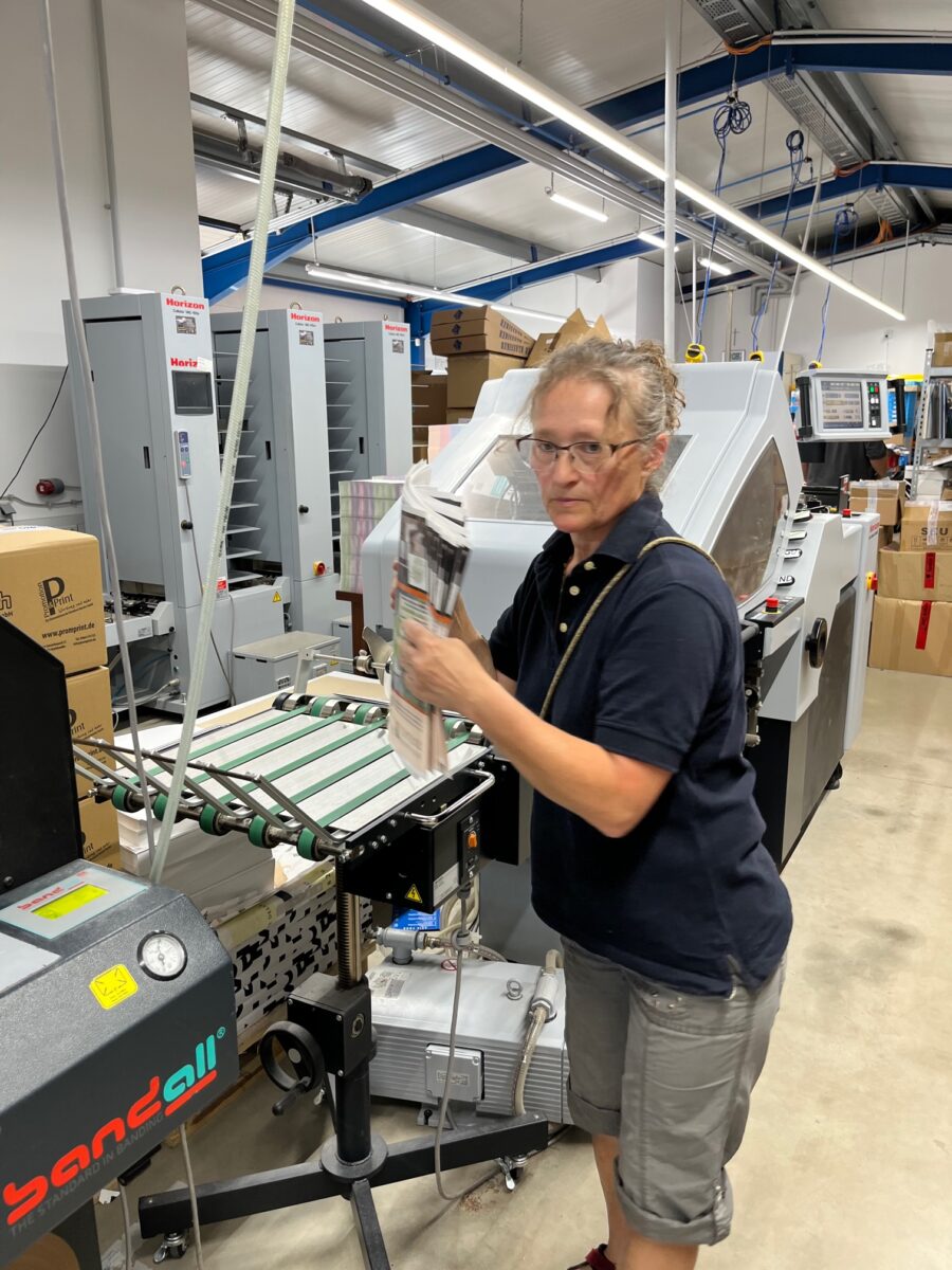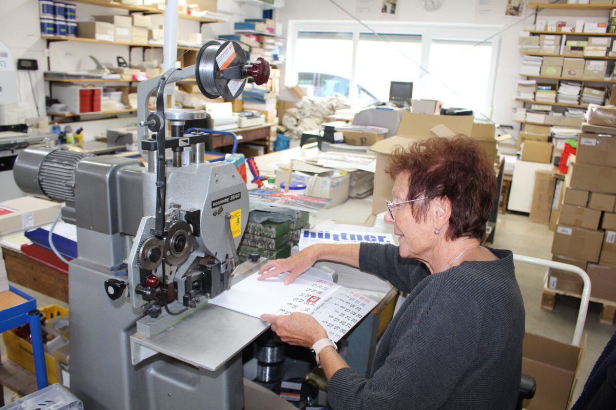 Flexibel ist man bei Hutzler. Das hatte ja der Betrieb mit seiner Maskenproduktion in Corona-Zeiten unter Beweis gestellt. Immer wieder mal muss auf den letzten Drücker gearbeitet werden. So brauchte ein Kunde ganz dringend Visitenkarten. Innerhalb einer Stunde waren sie fertig. Nicht zu vergessen: die Qualität. “Nichts verlässt ungeprüft das Haus”, erzählt die Geschäftsführerin. Um immer auf den neuesten Stand zu bleiben, ist es für die Geschäftsführerin wichtig, in neue Maschinen zu investieren. Erst heuer wurden eine neue Broschürenfertigungsstraße, ein neuer Großformatdrucker und eine halbautomatische Kalenderbindemaschine angeschafft.