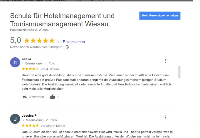 „Warum freut uns das so extrem? Ganz einfach, es gibt nichts Ehrlicheres als Bewertungen, die Menschen freiwillig abgeben.“ So verhalte es sich mit den Einträgen, die man auf Google unter dem Auftritt der Schule für Hotel- und Tourismusmanagement fände. 41 Rezensionen aus den letzten 10 Jahren hat die Schule dort – und alle Bewerterinnen und Bewerter geben 5 Sterne. Die Schüler und Schülerinnen haben direkt selbst nochmal gegoogelt und festgestellt, dass in Deutschland für den Suchbegriff Schule nur noch eine Tauchschule und eine Baumschule auf 5,0 Sterne kommen.