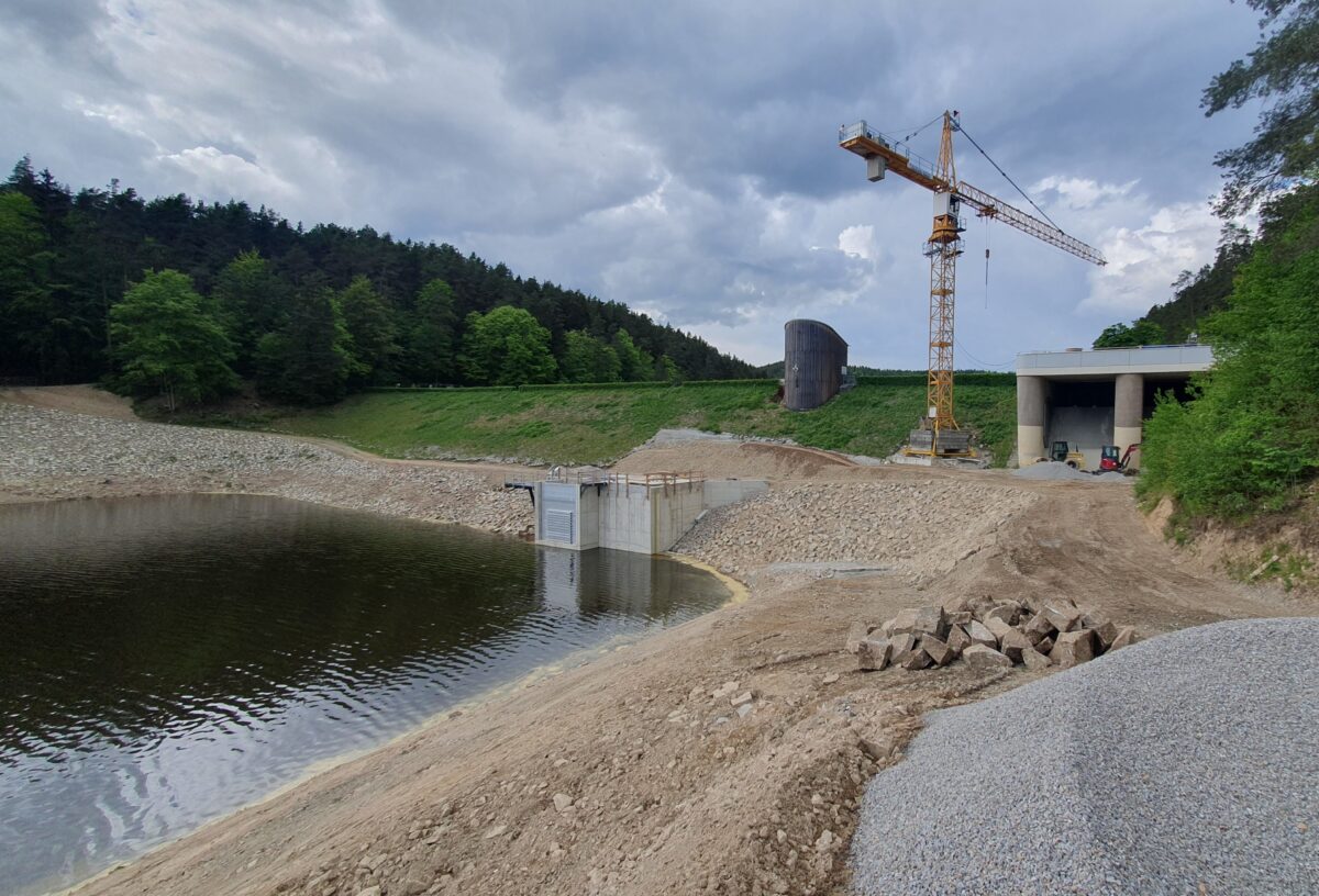 Der Betonbau am Entnahmeturm konnte zum Jahreswechsel fertiggestellt werden. Momentan laufen Montagearbeiten für Elektro- und Hydraulikleitungen sowie die Hinterfüllung des Entnahmeturms mit Schottermaterial. Die Böschung der Hauptsperre wird mit großen Wasserbausteinen gegen Erosion geschützt. Außerdem wird derzeit die Gelegenheit genutzt und die gesamte Elektro- und Meldeverkabelung am Speicher erneuert.