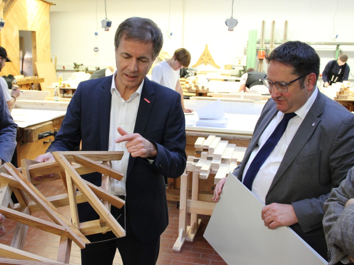 Nach der Übergabe besichtigten Tobias Gotthardt und Hans Schmidt die Werkstätten im Bildungszentrum. Am Termin nahmen zudem der Landtagsabgeordnete Dr. Stephan Oetzinger, Kreishandwerksmeister Erich Sperber und die Geschäftsführerin der KHS Nordoberpfalz Stefanie Ramsl teil.
