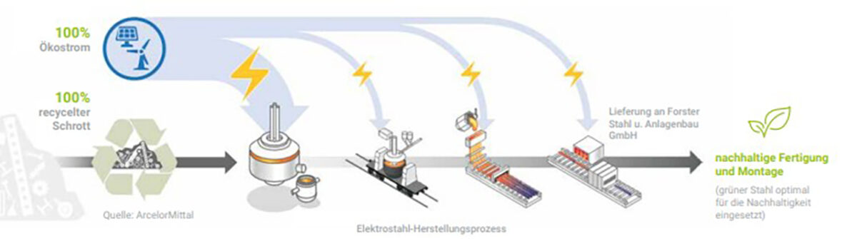 - Grüner Stahl: Verarbeitet wird recycelter, elektrisch eingeschmolzener Stahl (Schrottbasis)