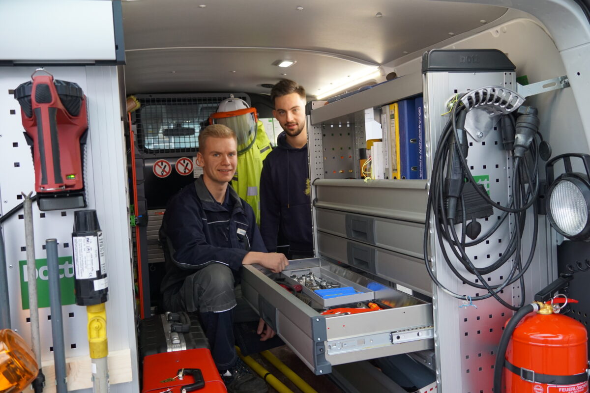 Oliver ist seit gut einem Jahr mit seiner Ausbildung fertig und betreut jetzt andere Azubis, Tobias ist gerade fertig geworden. Beide profitierten von der guten Übernahme-Quote. 99,9 Prozent der Azubis werden in ein unbefristetes Arbeitsverhältnis übernommen. „Es fehlt in der Ausbildung an nichts“, erzählt Tobias. „Man ist mit allen per Du, hilft sich gegenseitig und bekommt immer, was man für die Arbeit braucht – vom Laptop bis zum Servicefahrzeug.“