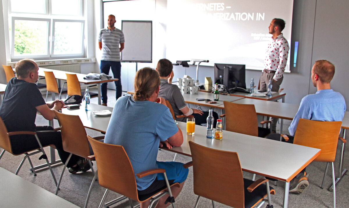 So gerüstet dürfen wir jetzt also ins Allerheiligste der IT-Anglizismen und Programmier-Akronyme: Da wo die CPUs, EKS, OCI, LSP, VMs, C++, Pods und Nodes nur so im virtuellen Raum schwirren, bis einem schwindelig wird. Dort wo nicht bereitgestellt, sondern deployed wird, und wo es keine Anfragen, sondern Requests gibt. Dort, wo das Digital Craftmanship, die Meister des Software-Handwerks, in einer Themenvielfalt und Tiefe chatten, dass einem die Ohren schlackern. Aufgemerkt!