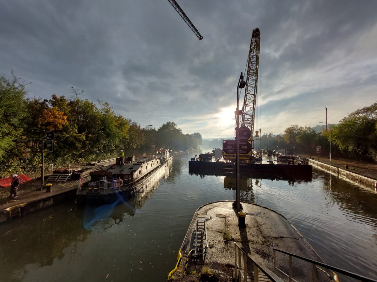 Anfang September 2022 hatte die Hermann GmbH Maschinenbautechnologie mit Sitz in Weiden in der Oberpfalz mit dem Ersatzneubau der linken Schleusenkammer in Besigheim begonnen. Jetzt steht nach zwei Jahren harter Arbeit und vielen komplexen Themen ein Meilenstein des Projekts bevor. Für ein Bauvorhaben in derartigen Dimensionen sind entsprechend sehr große Fahrzeuge und Hilfsmittel nötig.