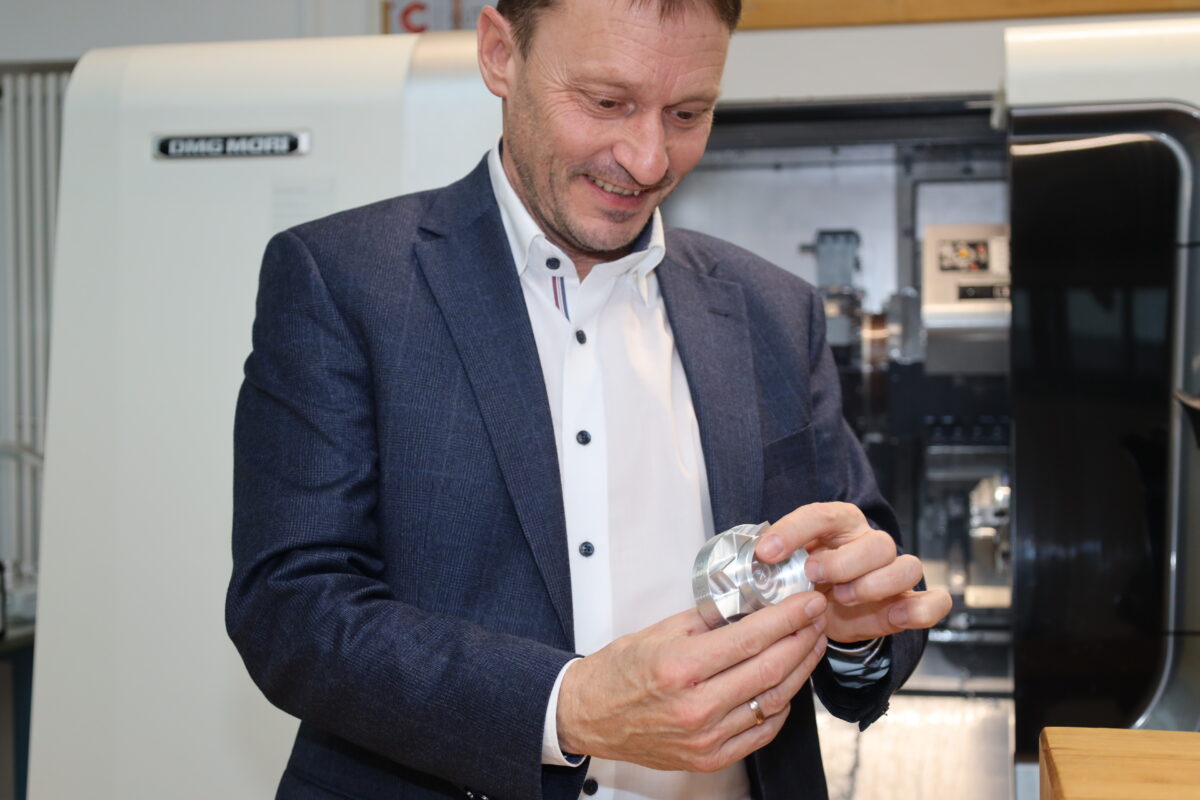 Wie die CNC-Maschine funktioniert veranschaulichte Teamkoordinator und Zerspanungsmechaniker Thomas Glaser bei der Herstellung eines Metall-Kerzenständers inklusive Gravur. „Die Maschine kann jede beliebige Form auf ein Hundertstel Millimeter genau herstellen. Hierbei geht es also vor allem um Präzisionsarbeit.” Ab nächste Woche Donnerstag wird sie dann im Unterricht eingesetzt. Thomas Glaser ist überzeugt, dass die Schülerinnen und Schüler mindestens genauso begeistert sein werden wie er selbst.