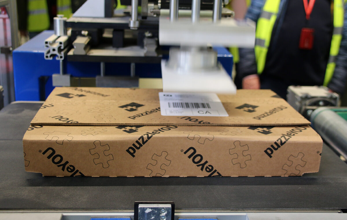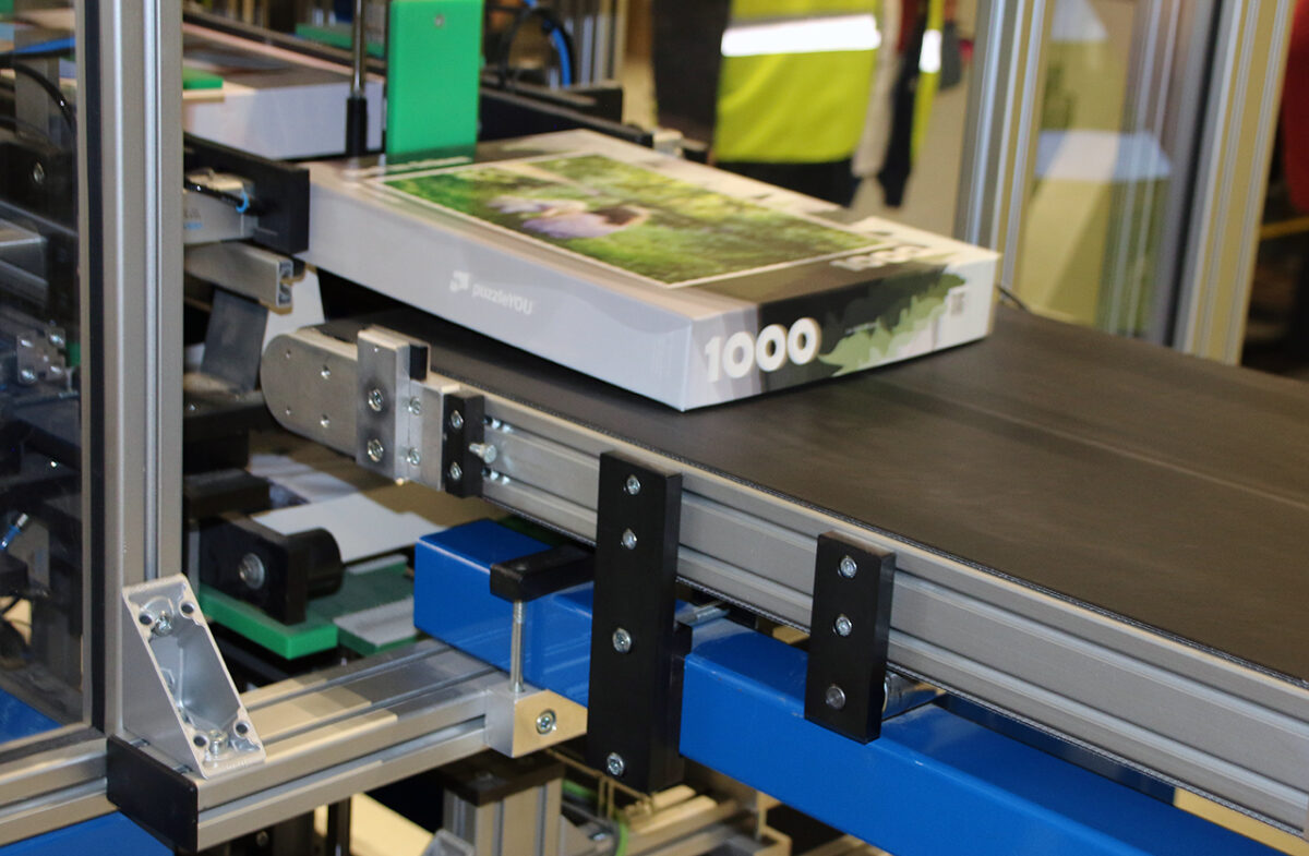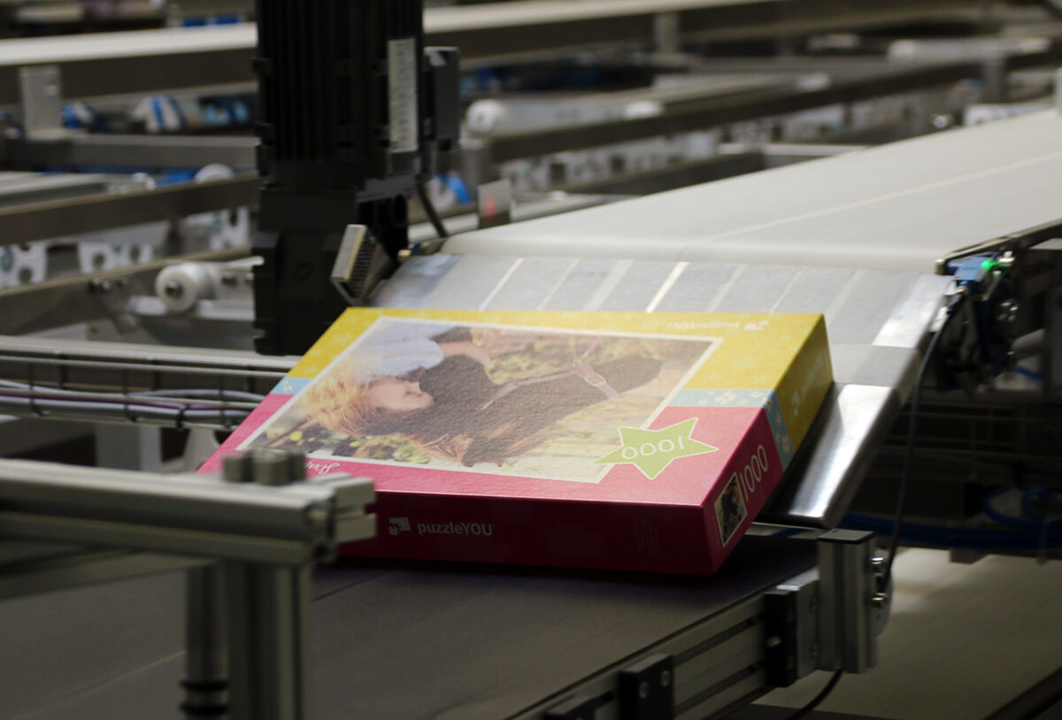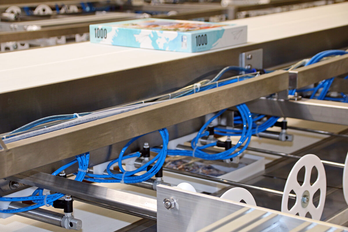 Die Puzzle-Schachtel auf der Reise in die Verpackungsstation. Foto Jürgen Herda