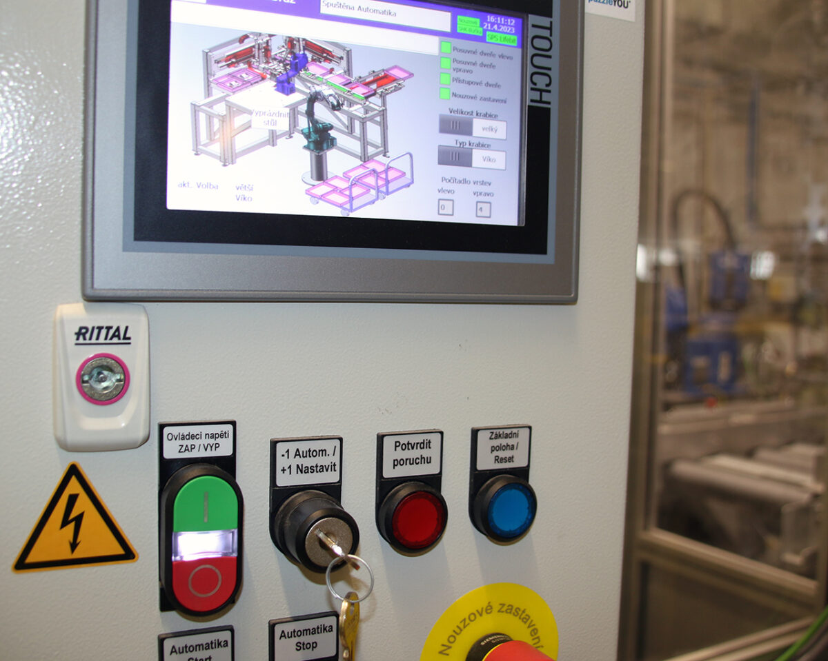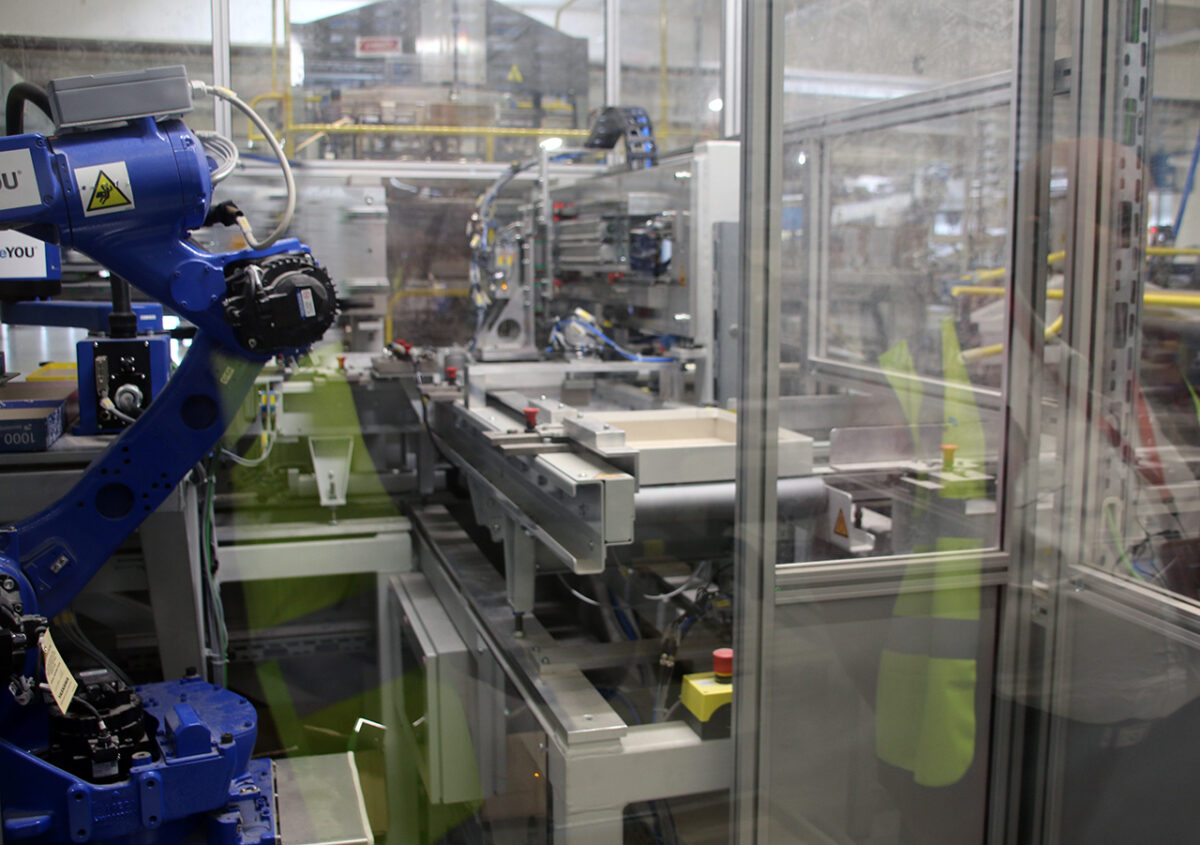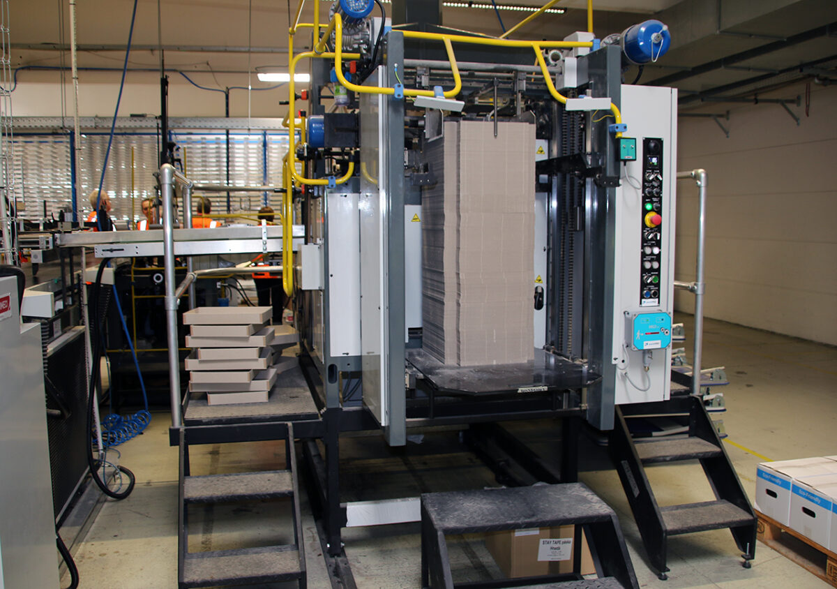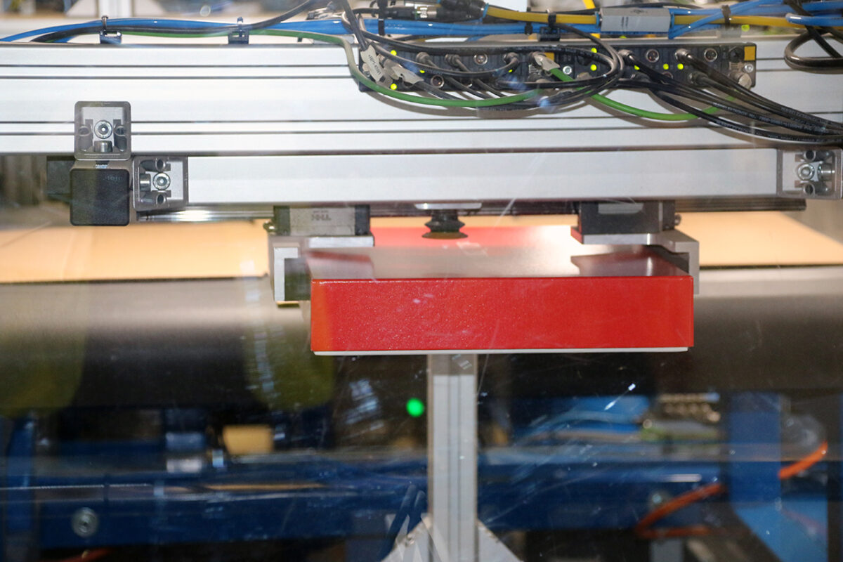 Ein Roboterarm greift die fertig verklebten Schachteln und stapelt sie. Foto: Jürgen Herda