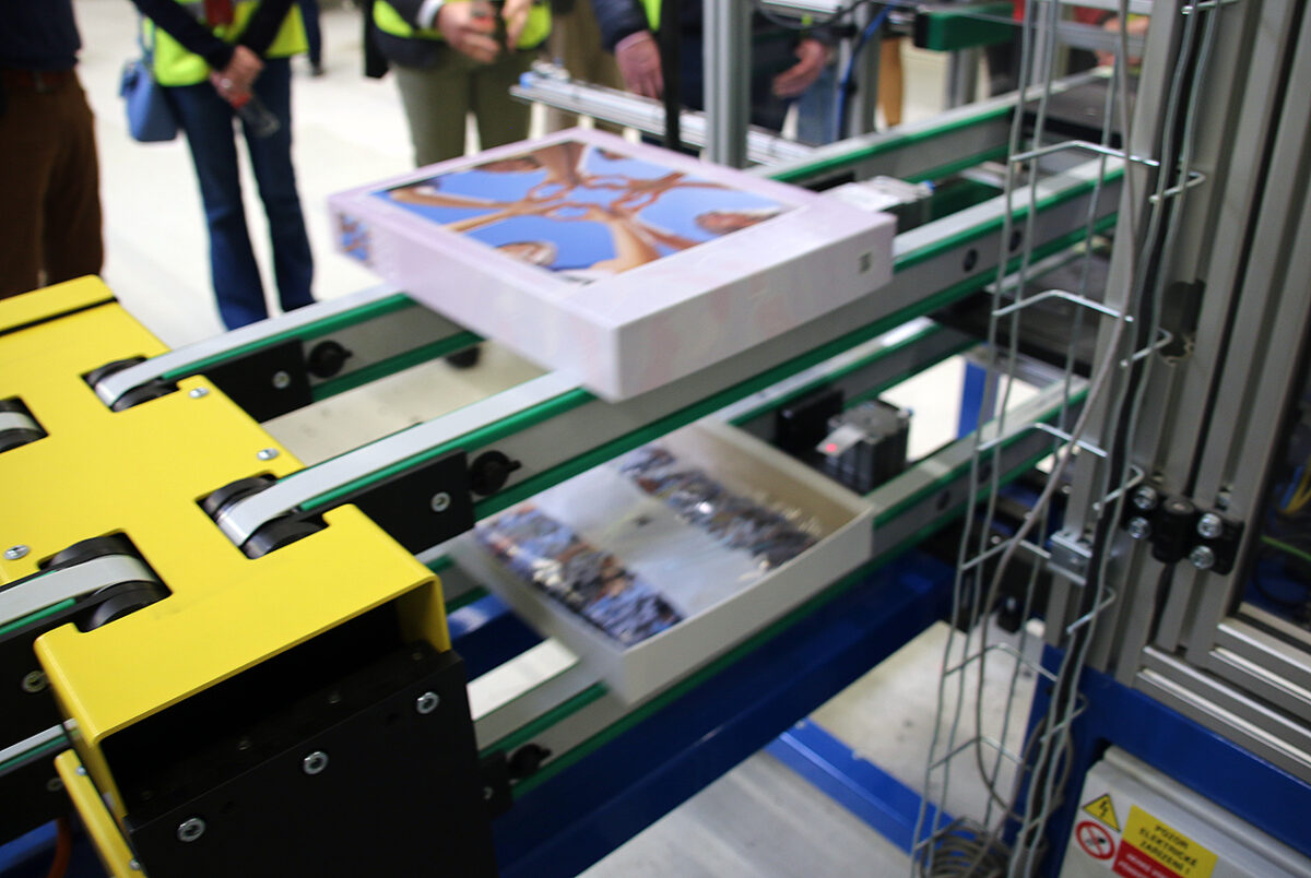 Das Schachtelunterteil ist mit einem Barcode ausgezeichnet: „Hier werden zugehörige Oberteile aufgelegt und verheiratet. Sie laufen auf den Bändern übereinander in den sogenannten Zudeckler.“ Foto: Jürgen Herda