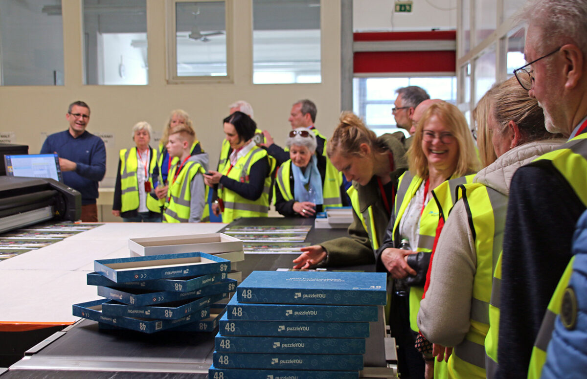 PuzzleYou-Geschäftsführer Christian Schramek zeigt den Besuchern des Wirtschaftsclubs Nordoberpfalz die hohe Kunst der Puzzle-Produktion. Foto: Jürgen Herda