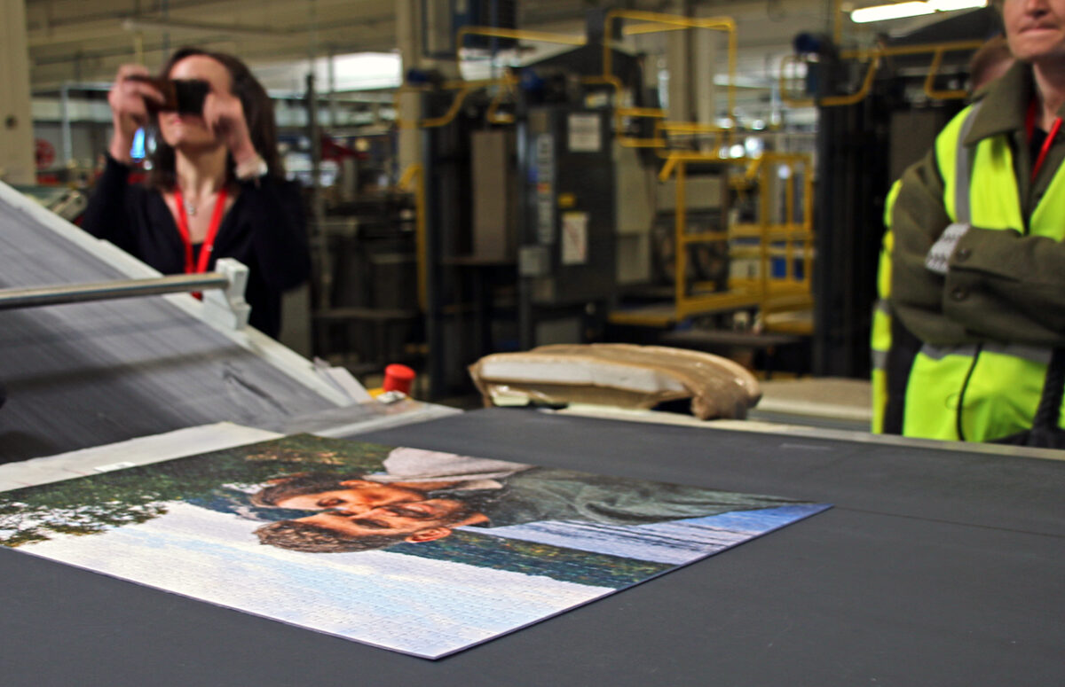 Das bedruckte Papier mit Feinleinenstruktur, das sich bei schwitzenden Händen haptisch besser anfühlt, wird anschließend auf Puzzlepappe geleimt. „Im Weihnachtsgeschäft verbrauchen wir 20 Kilometer Papier am Tag.“ Weil man die Puzzleteile immer wieder in den Händen hält, entsteht Reibung: „Wir verwenden UV-Lack, um die Produkte zu schützen.“ Foto: Jürgen Herda