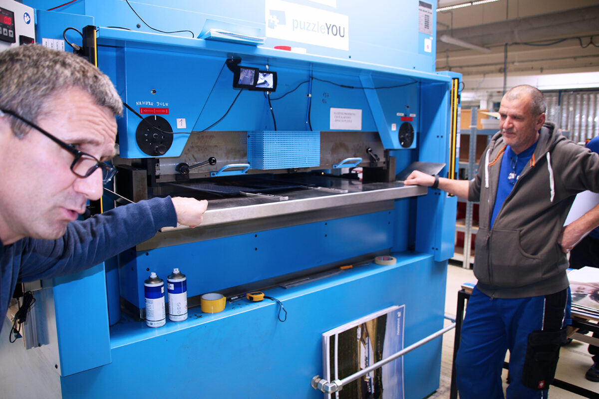 Das Stanzen des Puzzles erfolgt mit einem Druck von 1000 Tonnen: „Da sind 70 Meter Messer für 1000-Teile-Puzzles verbaut“, erklärt Schramek. „Ein Schwungrad ist an einen Exzenter gekoppelt, der für die Stanzbewegung verantwortlich ist. Der Gummi wird komprimiert und stößt die Teile anschließend aus.“ Man habe mehrere Stanzformen, eine halte etwa 100.000 Arbeitsgänge – abhängig von der Einstellung der Maschine: „Die Messer sollten nicht auf dem Tisch aufschlagen. Die Messer händisch so zu biegen, dass sie passen, ist filigranstes Uhrmacherhandwerk.“ Die hydraulische Stanze kommt entsprechend aus der Schweiz. Foto: Jürgen Herda