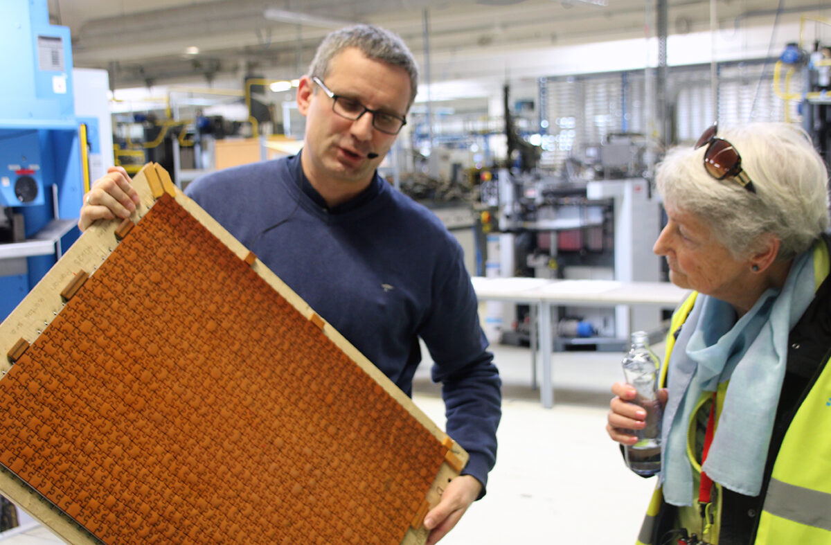 Christian Schramek zeigt einer Besuchergruppe des Wirtschaftsclubs Nordoberpfalz, wie das Messer im tschechischen Werk in Bělá nad Radbuzou durch das Puzzle gleitet. Archivfoto: Jürgen Herda