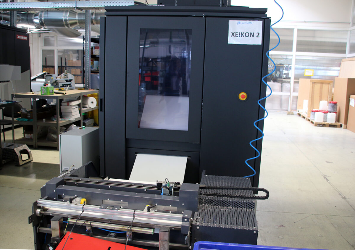 PuzzleYou startete die Produktion mit einer Xeikon 6000, einer digitalen Druckmaschine der ersten Generation. „Die machte 10 Meter pro Minute“, erklärt Christian Schramek, „durch das schnelle Wachstum hätten wir immer mehr Maschinen gebraucht.“ Deshalb kamen zwei neue Laserdrucker ins Haus: „Die Xeikon SX 20.000 und SX 30.000 schaffen 20 beziehungsweise 30 Meter pro Minute – das sorgt für mehr Output und ist weniger anstrengend.“ Die Kosten für eine Maschine liegen beim Preis eines schönen Einfamilienhauses. „Wir drucken mit 600 dpi, die Maschine kann auch 1200 dpi.“ Foto: Jürgen Herda