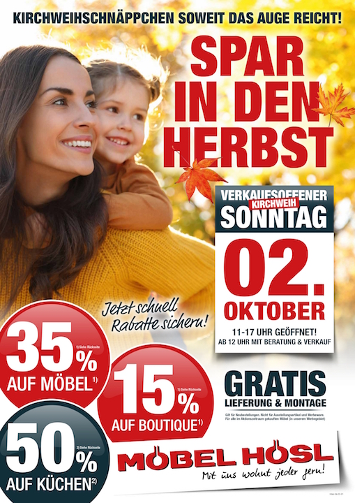 Sparfüchse und Schnäppchenjäger aufgepasst! Der 2. Oktober ist euer großer Tag. Möbel Hösl lädt zum großen Kirchweih-Shopping nach Schönkirch ein. Interessante Angebote und tolle Rabatte warten auf euch.