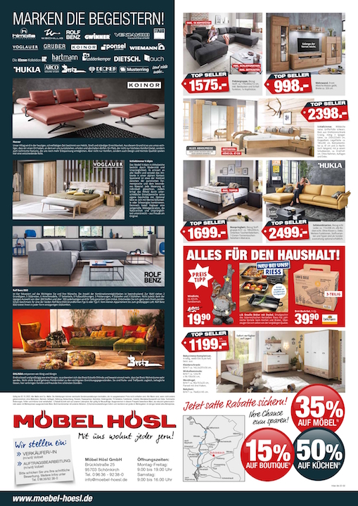 Spätestens jetzt sollten die Sparfüchse aber ihre Ohren spitzen. Auf Neubestellungen gibt es bei Möbel Hösl 35 Prozent Nachlass, bei Küchen sogar 50 Prozent und bei Boutique-Artikel spart man sich noch ordentliche 15 Prozent. Und die Schönkircher Möbelexperten legen sogar noch eins drauf: Alle Neubestellungen am Kirchweihsonntag werden zum Nulltarif nach Hause geliefert und montiert.