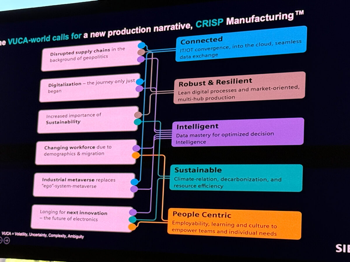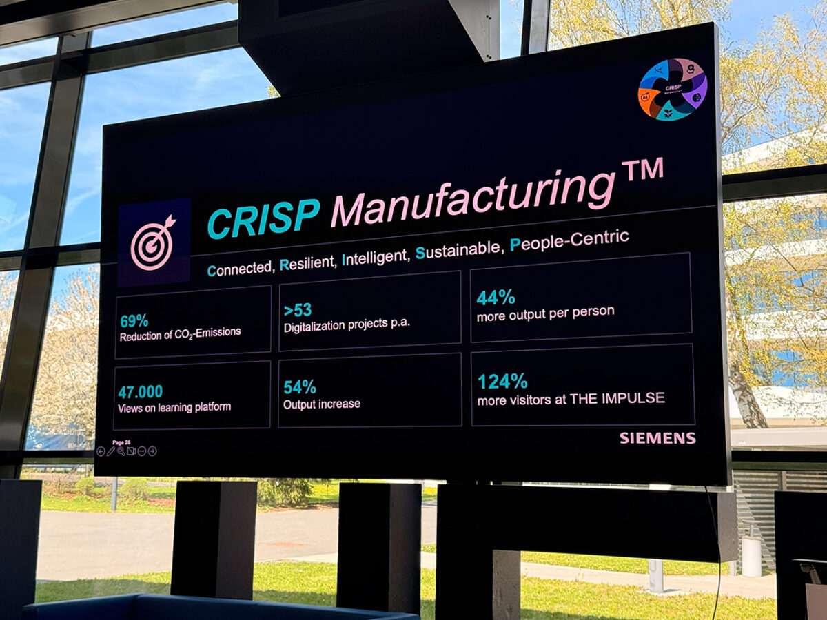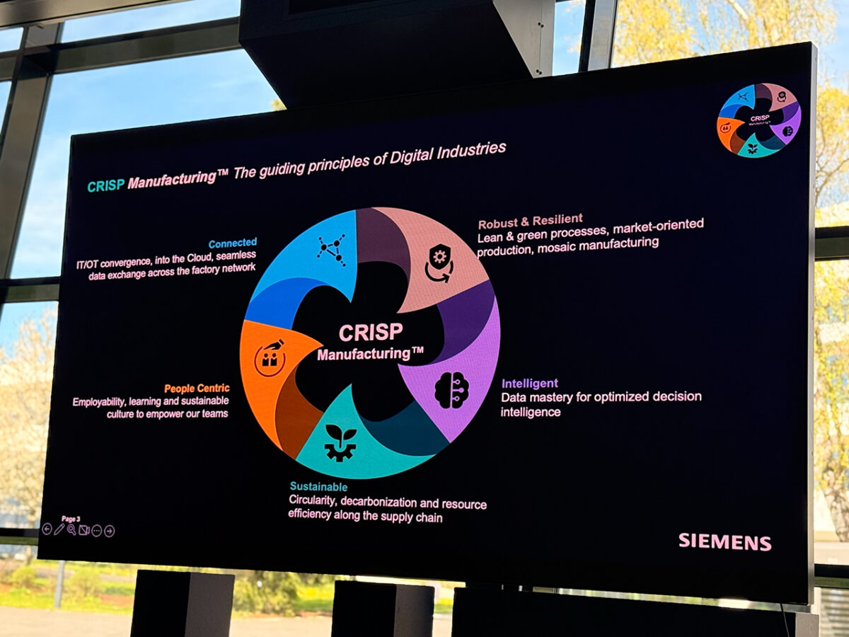 Dr. Gunter Beitinger stellte in seiner Keynote den Siemens-Ansatz CRISP Manufacturing vor: Connected, Robust & Resilient, Intelligent, Sustainable und People Centric. Dahinter steht die Frage, wie Industrie in einer Welt aus Pandemieerfahrungen, Lieferkettenbrüchen, geopolitischen Risiken, KI-Sprüngen, Demografie und Nachhaltigkeitsdruck handlungsfähig bleibt.