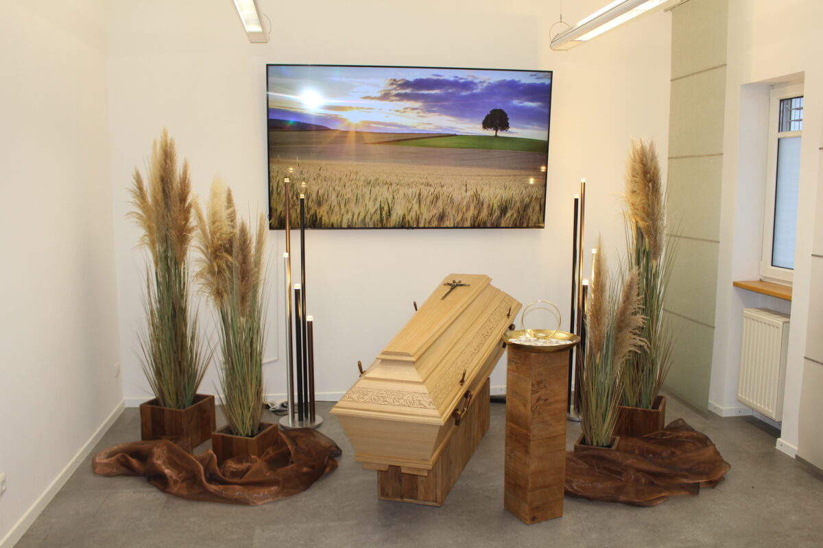 An der Wand über dem Sarg ist ein großer Bildschirm angebracht. Hier können Bilder des Verstorbenen oder stimmungsvolle Landschaftsfilme gezeigt werden. Vorbei sind also die Zeiten, als man in einem kalten, zugigen Leichenschauhaus stehen musste – bei den Gronauers zumindest. Und noch eine sehr persönliche Form des Abschiednehmens ist möglich: Ein Raum der Zwiesprache wurde eingerichtet.