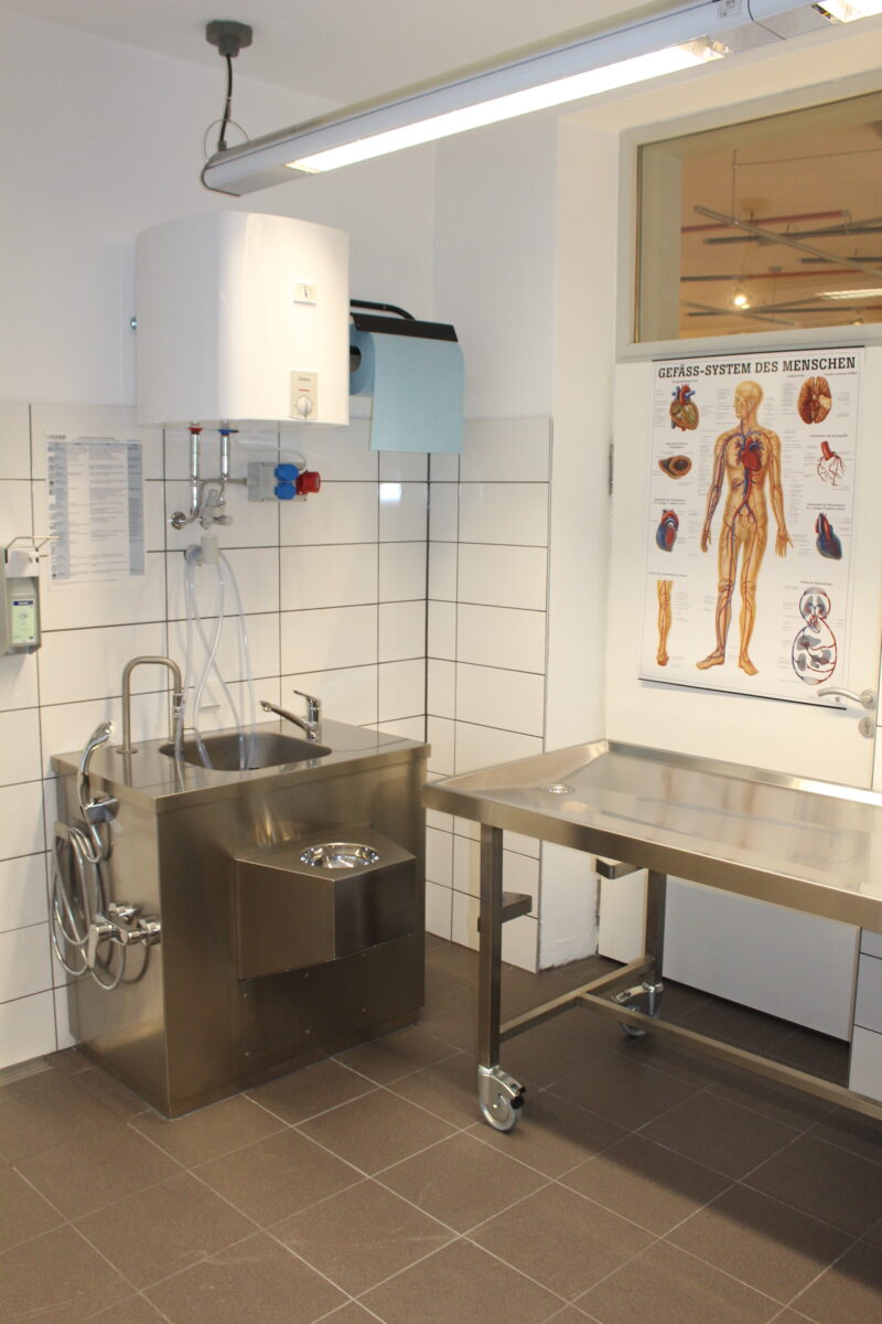Ein eigener hygienischer Versorgungsraum gehört mit zum Traueratelier. Hier werden die Verstorbenen gewaschen, eingekleidet, die Haare geföhnt und auch geschminkt. Gerne können die Angehörigen beim Zurechtmachen ihrer Liebsten mithelfen oder einfach nur dabei sein. “Wir würden uns freuen, wenn sich wieder öfter die Trauergemeinde vor dem offenen Sarg versammeln würde”, hoffen die beiden Jung-Unternehmer.