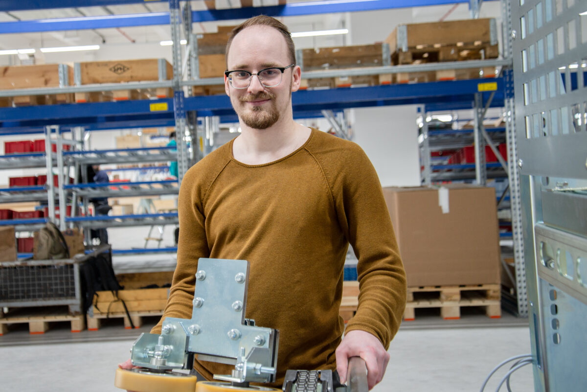 Derzeit arbeitet er, ebenso wie Matthias, in der Konstruktionsabteilung. Dort ist er verantwortlich für Projekt- und Variantenkonstruktionen sowie für die Betreuung und Entwicklung von Maschinen zur Palettenkommissionierung. “Die große Unterstützung” ist es, die Lukas bei WITRON schätzt, aber auch die umfassenden Sozialleistungen wie etwa die Altersvorsorge, die das Unternehmen seinen Beschäftigten gewährt. Und nicht zuletzt das Arbeitsklima: “Der Umgang unter den Kollegen ist richtig familiär.”
