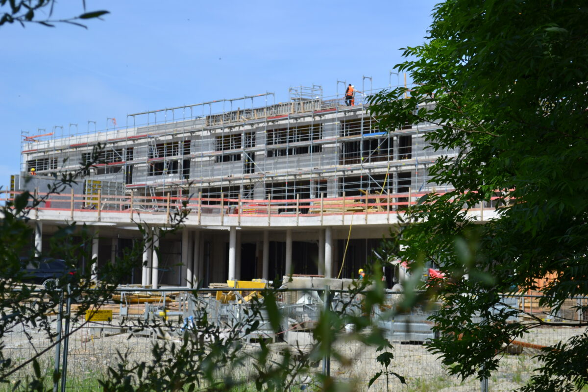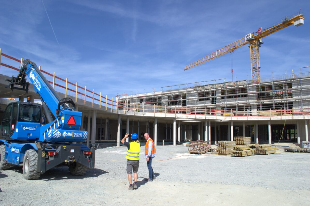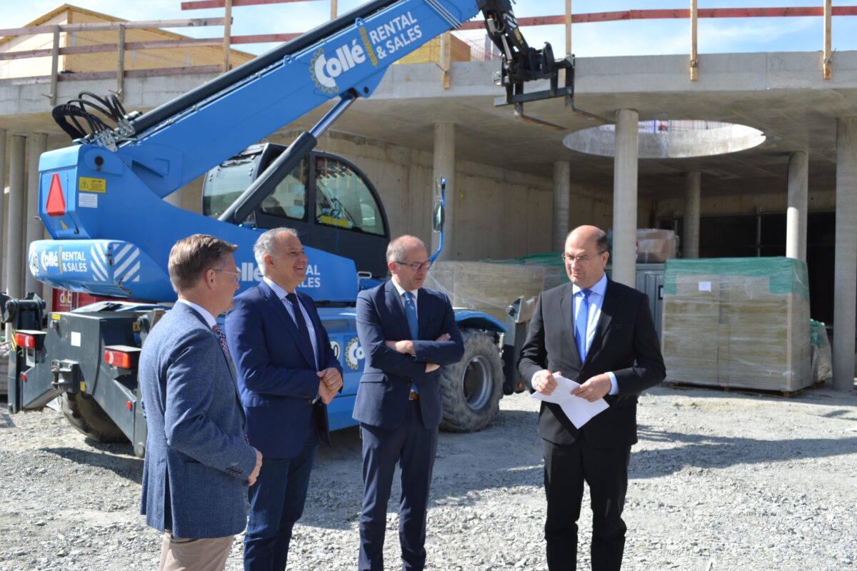 Architekt Markus Neuber nannte einige Zahlen: Insgesamt umfassen die Gebäude 16.000 Quadratmeter Geschossfläche und 60 Klassenzimmer mit Fachräumen für alle schulischen Bereiche. “Der Rohbau liegt in den letzten Zügen, die Fassade wird eingebaut und es laufen bereits die vielfältigen Installationen”, erklärte der Architekt. Natürlich werde die Schule nach modernsten energetischen Gesichtspunkten wie Fernwärme und Wärmerückgewinnung ausgestattet. Mit der Fertigstellung des Baus rechnet Neuber Ende 2024, Anfang 2025.