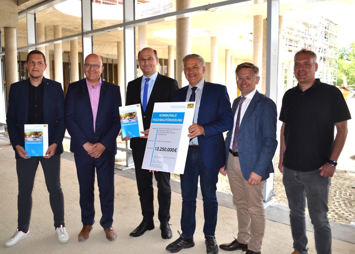 Während der Auftrieb der politischen Prominenz die fleißigen Arbeiter auf der Realschul-Baustelle kaum interessiert, geht es im künftigen Aufenthaltsraum der Ganztagsbetreuung um Millionenbeträge. Der Bayerische Finanzminister Albert Füracker höchstpersönlich überbringt frohe Kunde, besser, er bringt Geld in Form zweier wertvoller Förderbescheide. Der Landkreis Tirschenreuth als Bauherr kann die 13,25 Millionen Euro sehr gut brauchen, kostet das “größte Bauprojekt in der Geschichte des Landkreises” (Landrat Roland Grillmeier) doch an die 80 Millionen Euro. Die zwei Förderbescheide sind für den Bau der Schule mit den Schulsportanlagen (13 Millionen Euro) und für die Ganztagsschule (250.000 Euro).