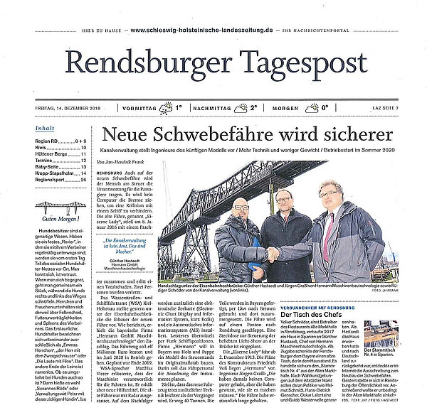 Ähnlich war das bei der Eröffnung der Rendsburger Schwebefähre in Schleswig-Holstein. Die Hängebahn über den Nord-Ost-Seekanal war mit einem Auftragswert von 11 Millionen Euro der größte Auftrag für Hermann Maschinenbau im Jahr 2018. Der NDR berichtete in etlichen TV-Beiträgen über den Neubau. Bei der “Rendsburger Tagespost” war die Schwebefähre mehrmals die Titelstory.