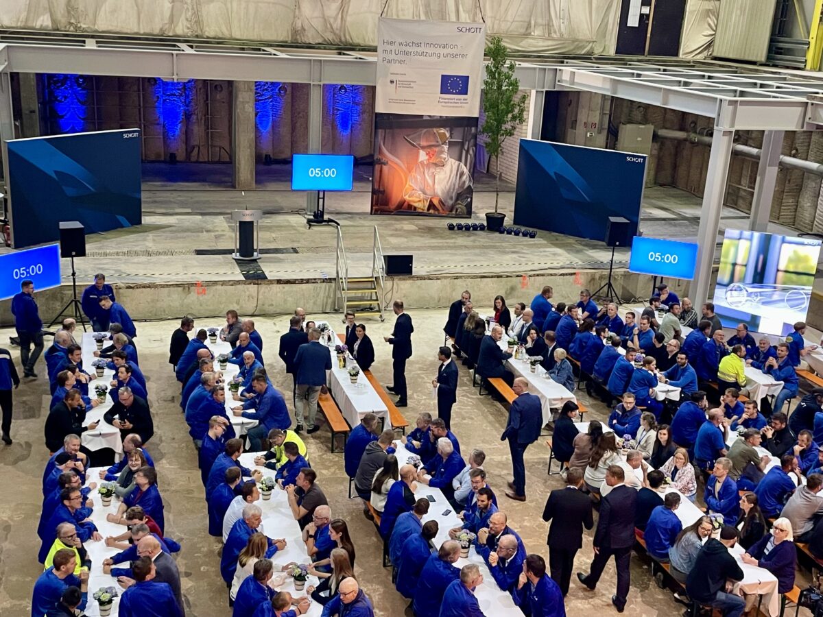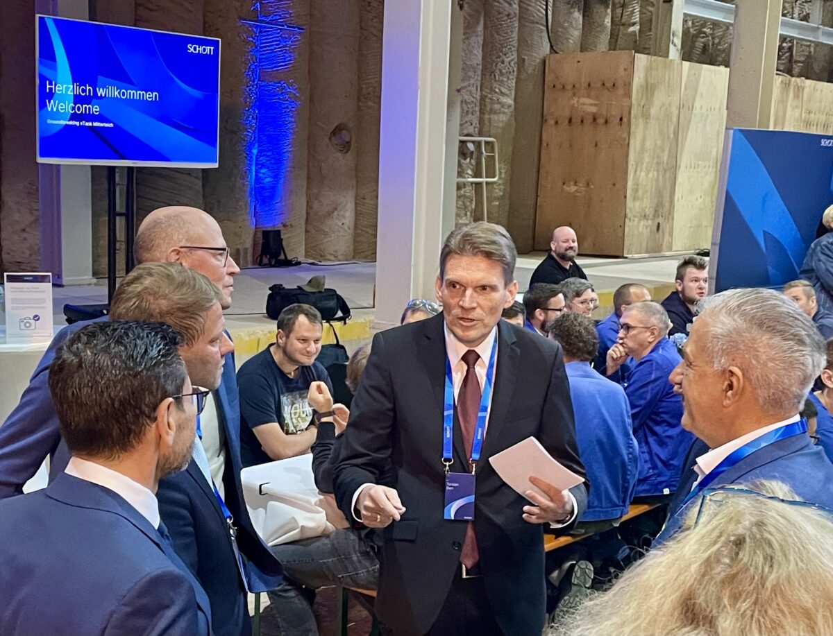Am Mittwoch gab’s hier Spezi und Würsteln für alle. Und einen wirklichen Grund zu feiern: Nach schlechter Auslastung und Kurzarbeit sind es genau diese Nachrichten, nach denen die rund 1.200 Mitarbeiter am Standort Mitterteich dürsten. “Die heutige Grundsteinlegung ist ein Versprechen”, sagte Dr. Torsten Derr, CEO der Schott AG aus Mainz: “Wir investieren in diesen Standort.”