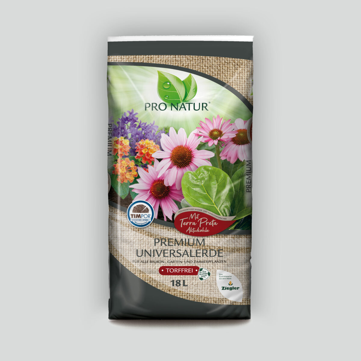 Für die Pro Natur Premium Universalerde werden ausschließlich regionale hochwertige Rohstoffe eingesetzt, wie beispielsweise Rindenhumus, Pflanzenkohle “Terra Preta” oder auch die Timpor Holzfaser Hydro. Bei Ziegler wird Nachhaltigkeit bis ins Detail gedacht, deshalb besteht auch die Verpackung der Universalerde aus recyceltem Plastik.