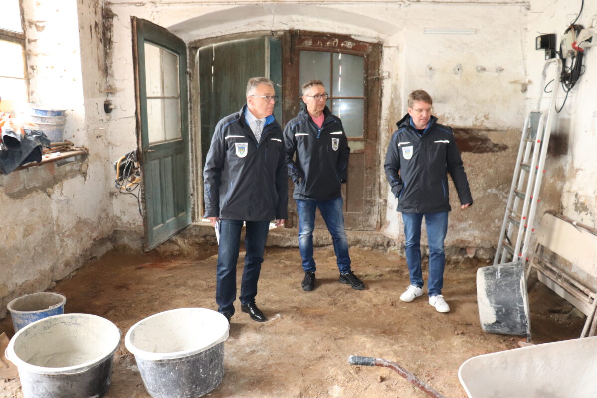 Nach ersten vorbereitenden Maßnahmen sind nun auch die Baumeisterarbeiten in vollem Gange. „Das neben der Fronfeste befindliche Gebäude atmet Geschichte – und hat bei der Übernahme durch die Stadt Tirschenreuth noch über zahlreiche alte Arbeitsgeräte und Maschinen verfügt. Diese haben die Mitglieder des Handwerkerscheune-Arbeitskreises für den Moment sichergestellt“, so Bürgermeister Franz Stahl bei einer Vor-Ort-Begehung mit Stadtbaumeister Andreas Ockl und Bauamt-Projektleiter Robert Reith.