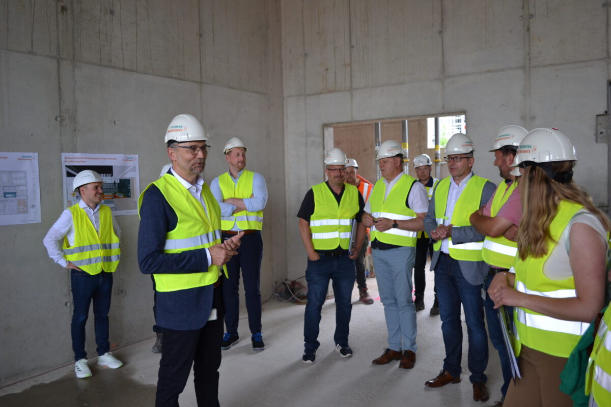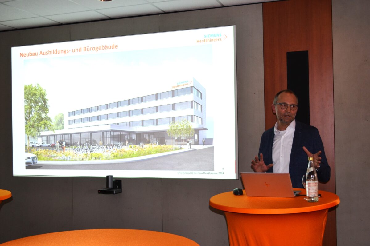 Für viele junge Menschen ist ein Ausbildungsplatz bei Siemens Healthineers die Erfüllung eines Traums. Spätestens im nächsten Jahr kann dieser Traum wieder für Dutzende Jugendliche wahr werden. “Wir suchen für 2025 noch junge Frauen und Männer, die den Beruf des Mechatronikers lernen wollen”, erklärt Standort-Leiter Bernhard Rupprecht bei der Begrüßung der Gäste, die der Konzern zur Baustellenbesichtigung eingeladen hatte. Interessierte könnten sich bereits jetzt für das kommende Jahr bewerben. Man bekomme zwar nach wie vor genügend Bewerbungen, müsse aber den Interessenten auch etwas bieten. “Früher konnten sich die Arbeitgeber die Bewerber aussuchen, heute suchen sich die Leute die Firma aus, in der sie arbeiten wollen.”