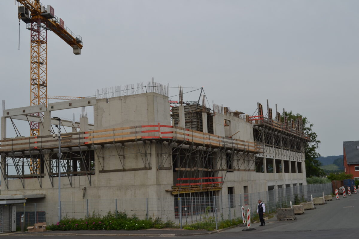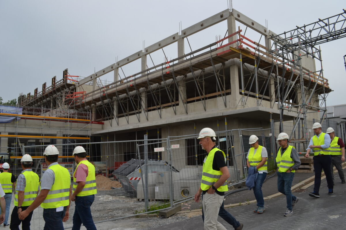 Das neue Ausbildungs- und Bürogebäude, das “Education & Development Center”, entsteht exakt an der Stelle des alten, abgerissenen Bürogebäudes. Auf 5000 Quadratmetern in vier Geschossen beherbergt der 20-Millionen-Euro-Bau Büros für Forschung und Entwicklung (60 Prozent der Gesamtfläche auf drei Geschossen) sowie einen neuen Bereich für Ausbildung und Duales Studium (40 Prozent). Projektleiterin Madeleine Kugler, Oliver Maier, Projektleiter Ausbildung, und Thomas Lange erläutern den Gästen, was im Neubau genau gemacht wird und wer dort wo ab Anfang 2025 seinen Arbeitsplatz hat.