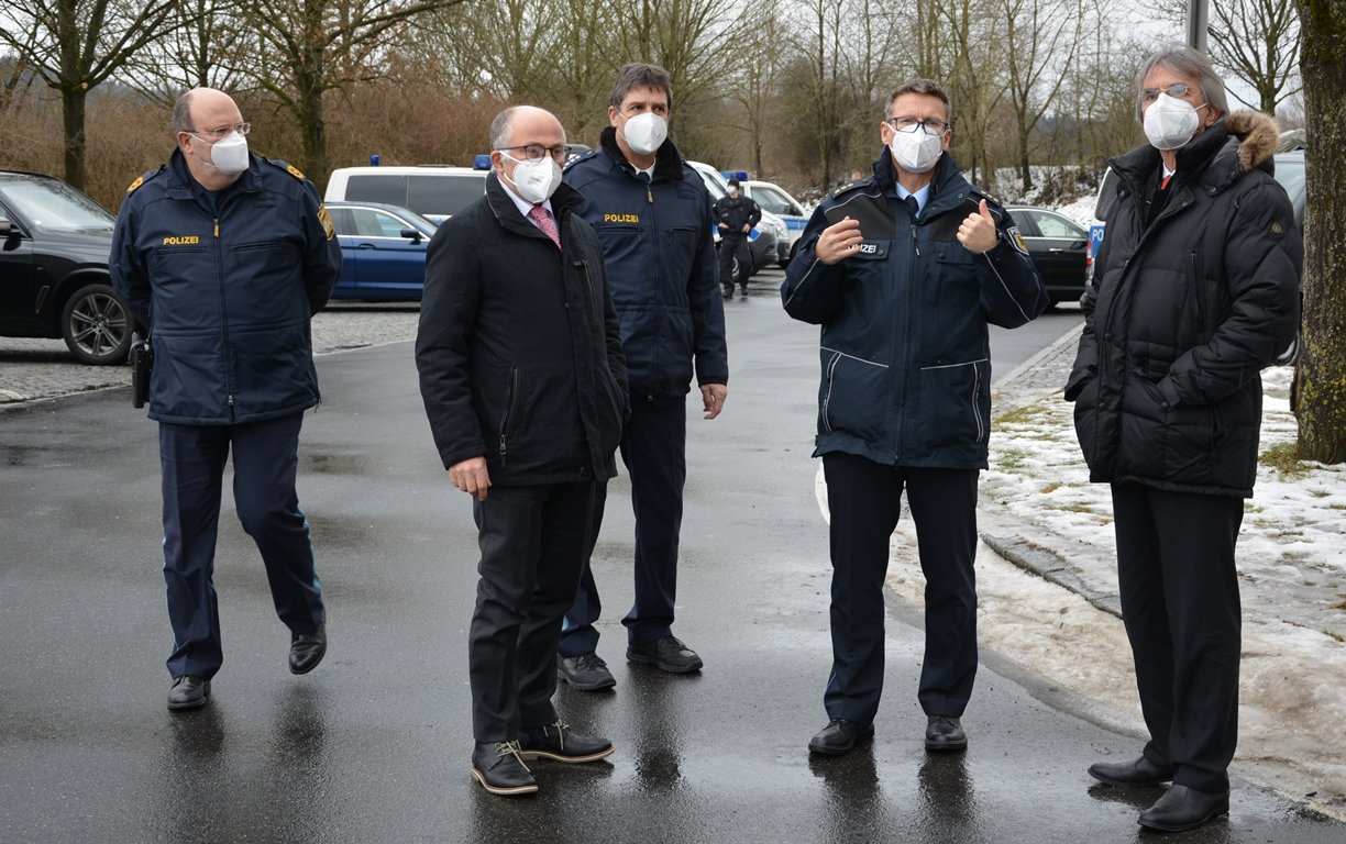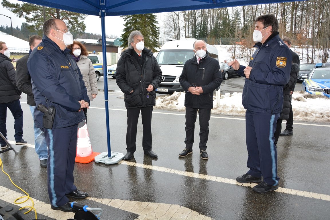 Nach der Besichtigung der Teststation des Landratsamts an der Staatstraße in Frankenreuth hat der Regierungspräsident die Gelegenheit genutzt, an der nahegelegenen Grenzkontrollstelle mit den diensthabenden Beamtinnen und Beamten der Bayerischen Polizei ins Gespräch zu kommen. Im Anschluss daran wurde die neu eingerichtete, provisorische Grenzkontrollstelle auf dem Parkplatz Zengerhof an der Autobahn A6 besichtigt, die, anders als in Frankenreuth, durch die Bundespolizei betrieben wird.