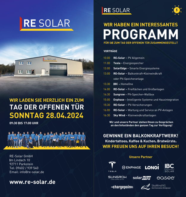- RE-Solar zeigt an diesem Tag die Nutzung von Balkonkraftanlagen und wird dazu ein Balkonkraftwerk verlosen. Alle Interessierten können an diesem Tag zu einem Sonderpreis ein Balkonkraftwerk kaufen!