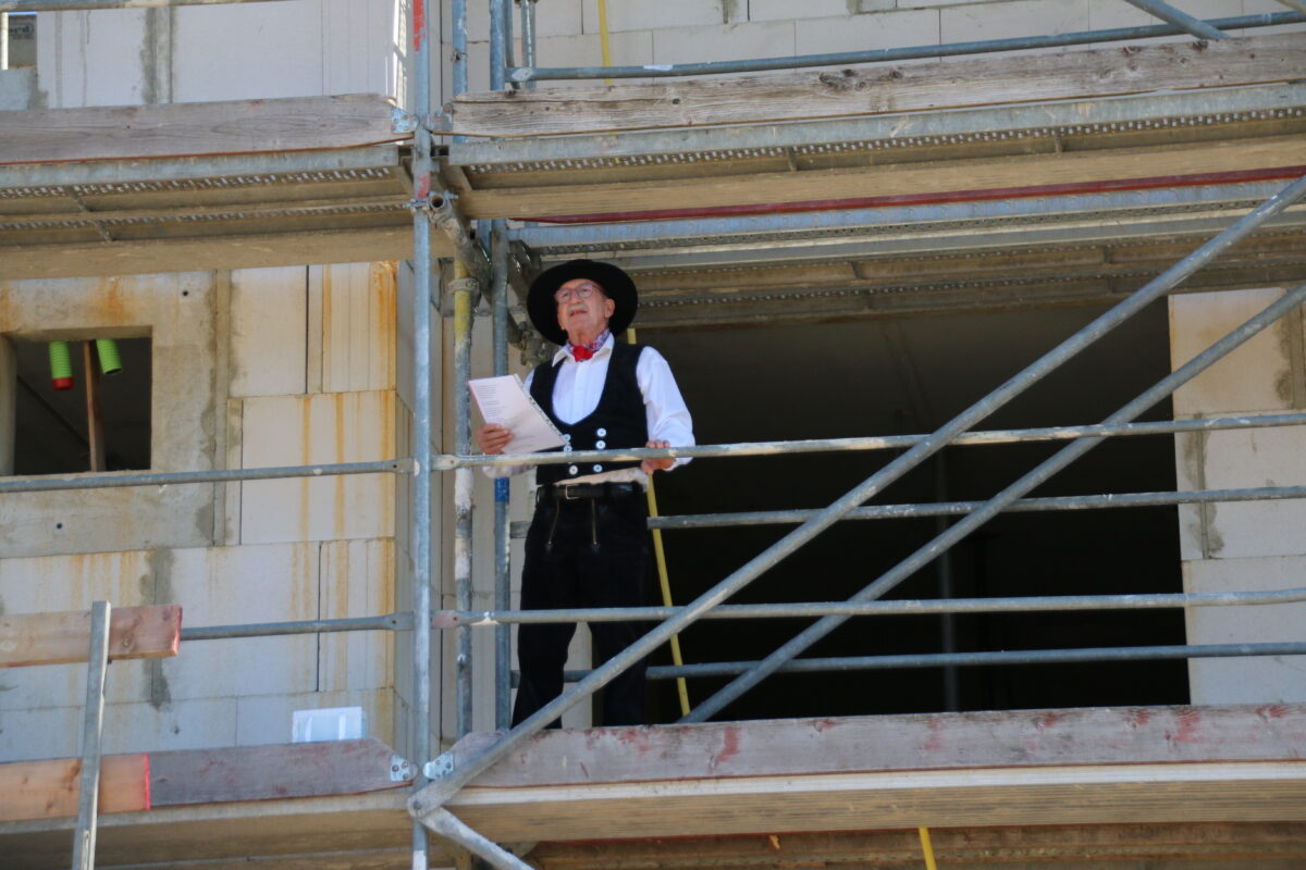 Wie es sich zu einem Richtfest gehört, hatte sich Zimmerer Willibald Hasl ein paar aktuelle Worte überlegt: “Weil im Kreis der Leute, bei dem hohen Baupreis heute, sich ein Haus fast kein Mann, wirklich kaum mehr leisten kann – Hier will ich dem Bauherrn danken, der so stark und ohne schwanken, diesen neuen Bau riskiert und erfolgreich finanziert.”