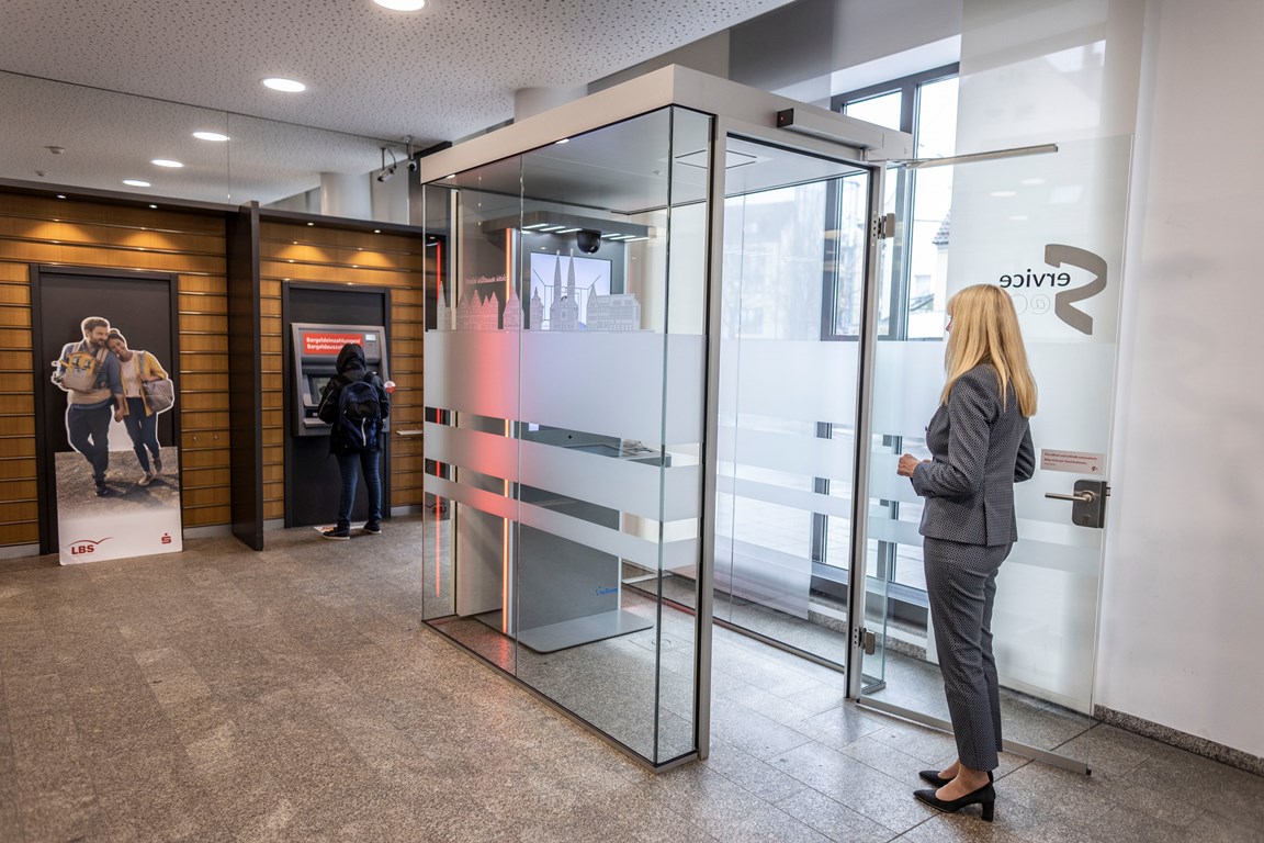 „Wenn die Kunden das erste Mal in diesen diskret abgeschirmten Raum treten, erwarten Sie erst einmal nicht, dass ihnen hier echte Menschen am Bildschirm gegenübertreten.“ Die Überraschung ist gelungen – und zwar meistens mit einem Lächeln auf dem Gesicht auf beiden Seiten des Terminals. „Unsere Mitarbeiterinnen und Mitarbeiter sind wirklich live und telepräsent vor Ort und können sich um die Anliegen der Kunden kümmern.“
