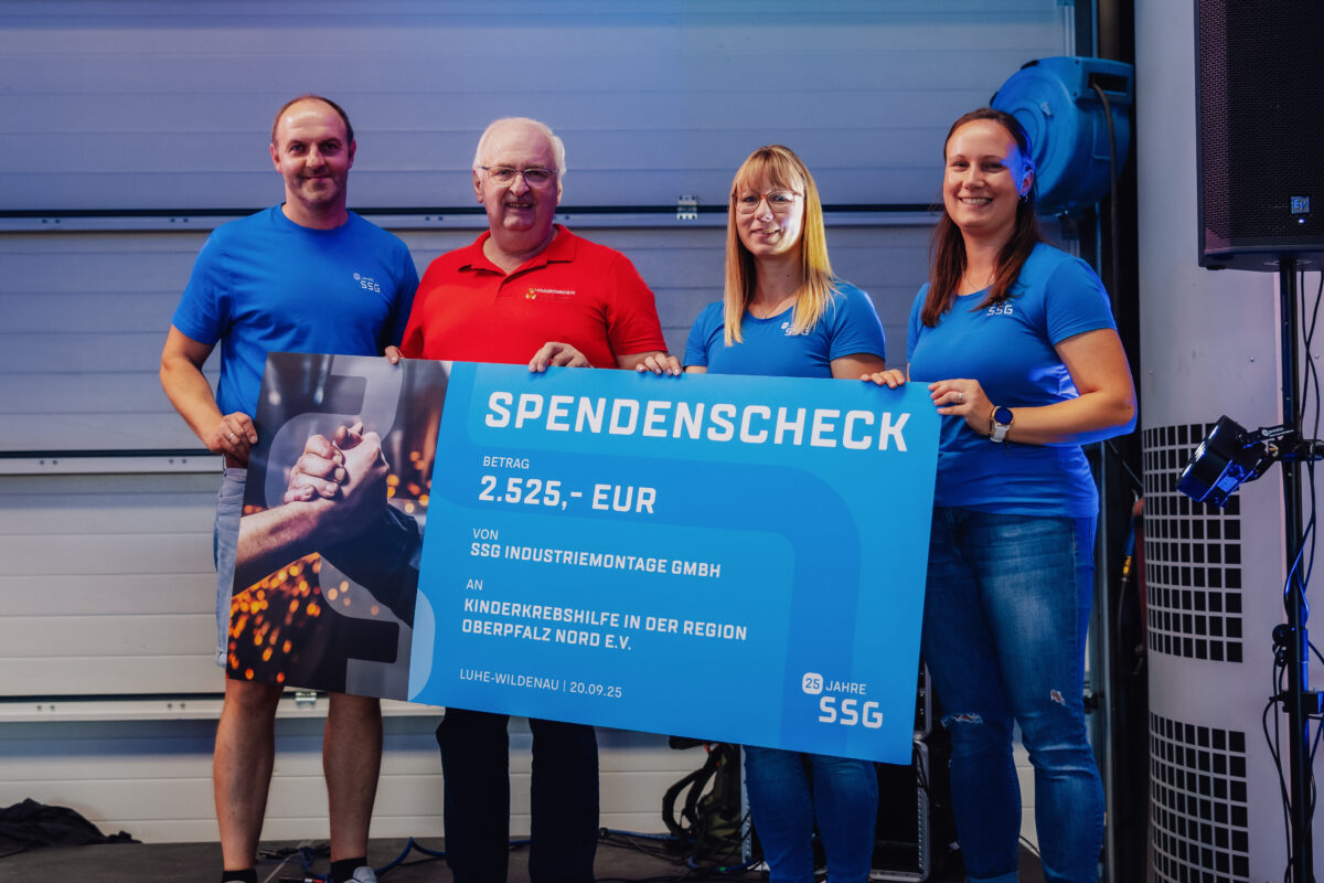 Die SSG Industriemontage GmbH hat gemeinsam mit ihren Gästen und Partnern beim 25-jährigen Firmenjubiläum eine großzügige Spende in Höhe von insgesamt über 7.200 Euro an die Kinderkrebshilfe Nordoberpfalz übergeben.