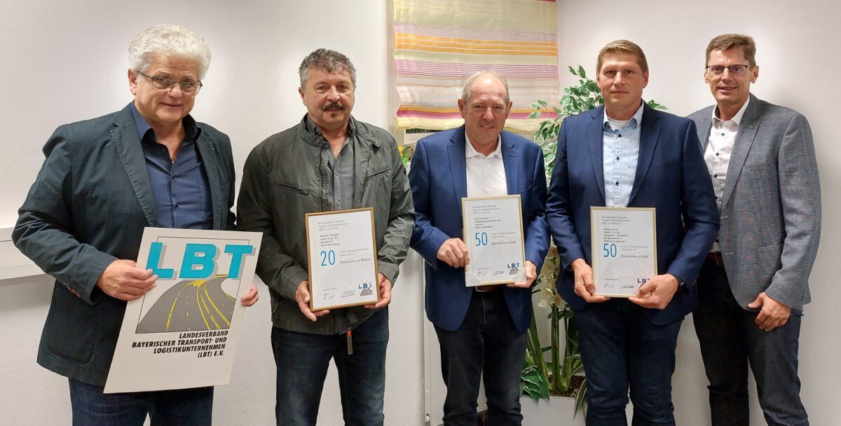 Zum Abschluss der Versammlung konnte der Geschäftsführer zusammen mit dem Bezirksdelegierten Georg Mayer das Unternehmen Hüttner GmbH & Co. KG aus Illschwang für seine zwanzigjährige Verbandsmitgliedschaft, die Firma Wurm Gregor e.K. aus Plößberg für ihre vierzigjährige Verbandsmitgliedschaft sowie Hirsch Stefan GmbH & Co. KG aus Schnaittenbach und Graf Transport- und Speditionsgesselschaft mbH aus Schwandorf für ihre fünfzigjährige Verbandsmitgliedschaft mit Urkunde und Anstecknadel ehren.