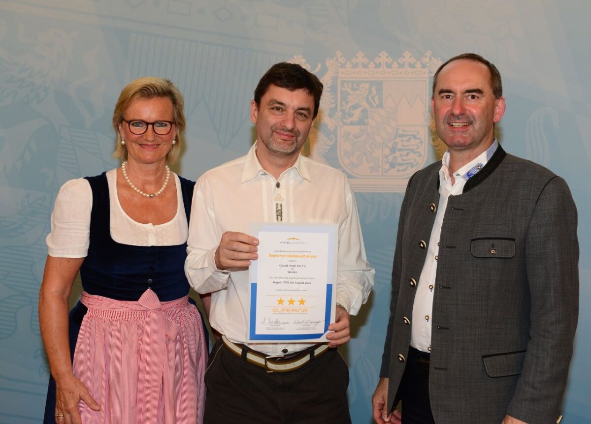 Wirtschafts- und Tourismusminister Hubert Aiwanger und die Präsidentin des Bayerischen Hotel- und Gaststättenverbandes DEHOGA Bayern Angela Inselkammer haben in München die begehrten Sterne-Klassifizierungen verliehen. Drei Sterne gab es dabei für das Weisse Ross in Konnersreuth und für das Klassik Hotel Am Tor in Weiden.