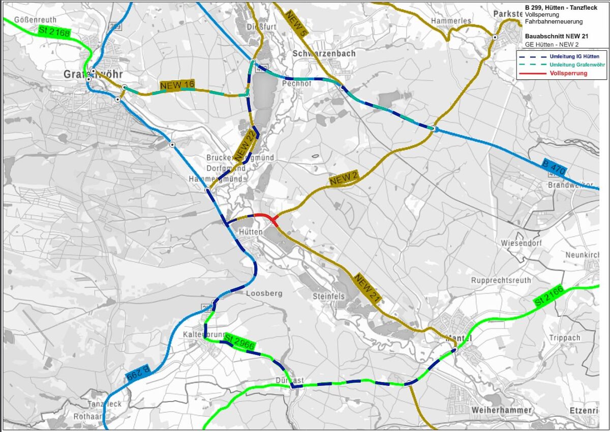 Seit Anfang April hat das Staatliche Bauamt Amberg-Sulzbach auf einer Baulänge von 7,5 Kilometern die schadhafte Fahrbahn der Bundesstraße 299 von Hütten bis Tanzfleck erneuert und verstärkt und im Anschluss den ersten rund einen Kilometer langen Teil der Kreisstraße NEW 21 im Bereich der Ortsumgehung Hütten. Nun folgt der letzte rund einen halben Kilometer lange Bauabschnitt vom Gewerbe-/Industriegebiet Hütten bis über die Einmündung der NEW 2 hinaus. Eine Gesamtfertigstellung ist spätestens am 14. Juni vorgesehen.