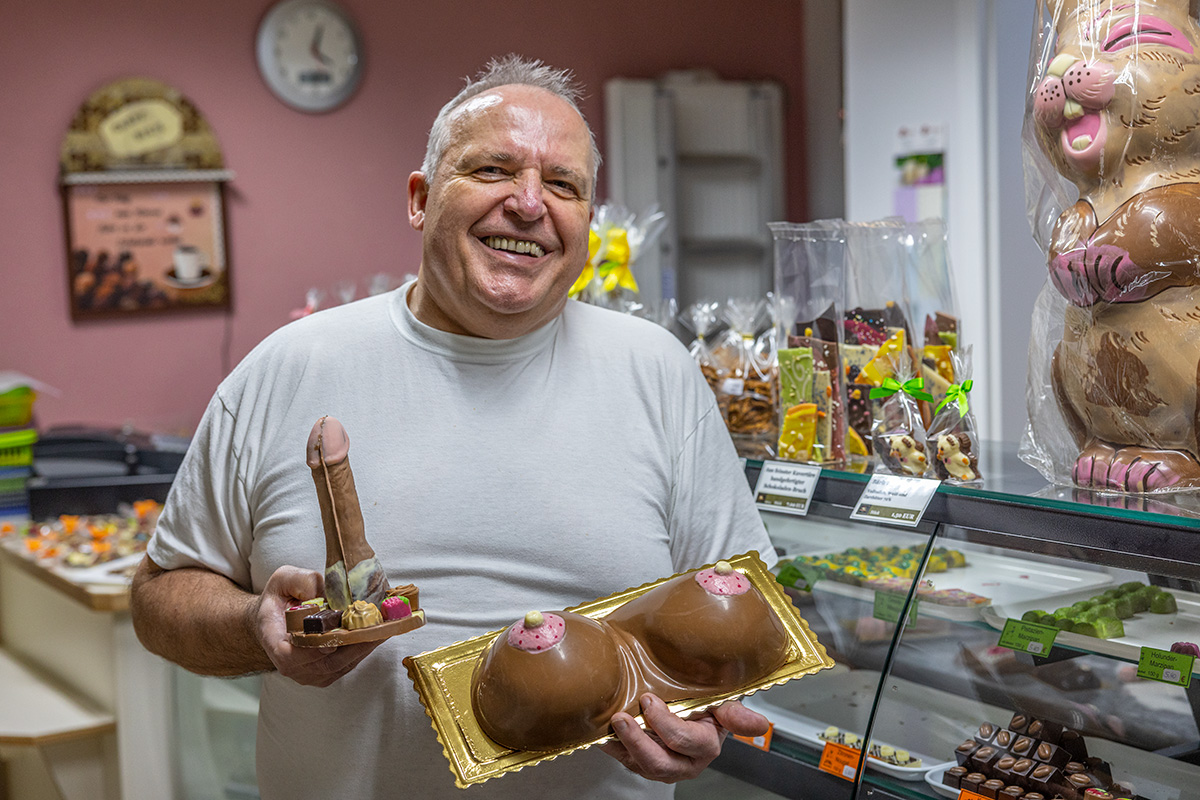 Der Junggesellenabschied brachte ihn auf die Idee, männliche und weibliche Geschlechtsteile in edle belgische Kuvertüre zu gießen. “Ein sinnvolleres Geschenk als die Gummipuppe, die dann eh bloß im Müll landet”, findet Welsch. Seine erotischen Schokoverführungen sind äußerst gefragt und werden mittlerweile für die verschiedensten Anlässe bestellt. Da hatte unlängst eine Endsechzigerin für ihren um einige Jahre älteren Mann eine große Brust geordert. “Sie wollte, dass ihr Partner mal wieder einen knackigen Busen zu sehen bekommt”, lacht der 59-Jährige.