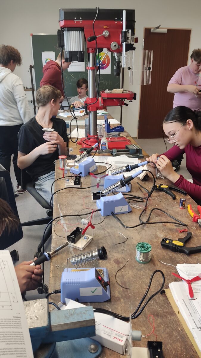 Im Berufsfeld Elektrotechnik und Mechatronik bauten die Schüler einen Tischlüfter. Sie arbeiteten mit Plexiglas, verwendeten eine Feile und bohrten Löcher mit einer Bohrmaschine. Der Lüfter wurde schließlich auf einer Holzplatte mit einem Akkuschrauber befestigt. Außerdem lernten sie, den Motor einzubauen, Kabel zu verlöten, eine Diode zu befestigen und die Batterie einzusetzen. Abschließend führten sie einen Funktionstest durch.